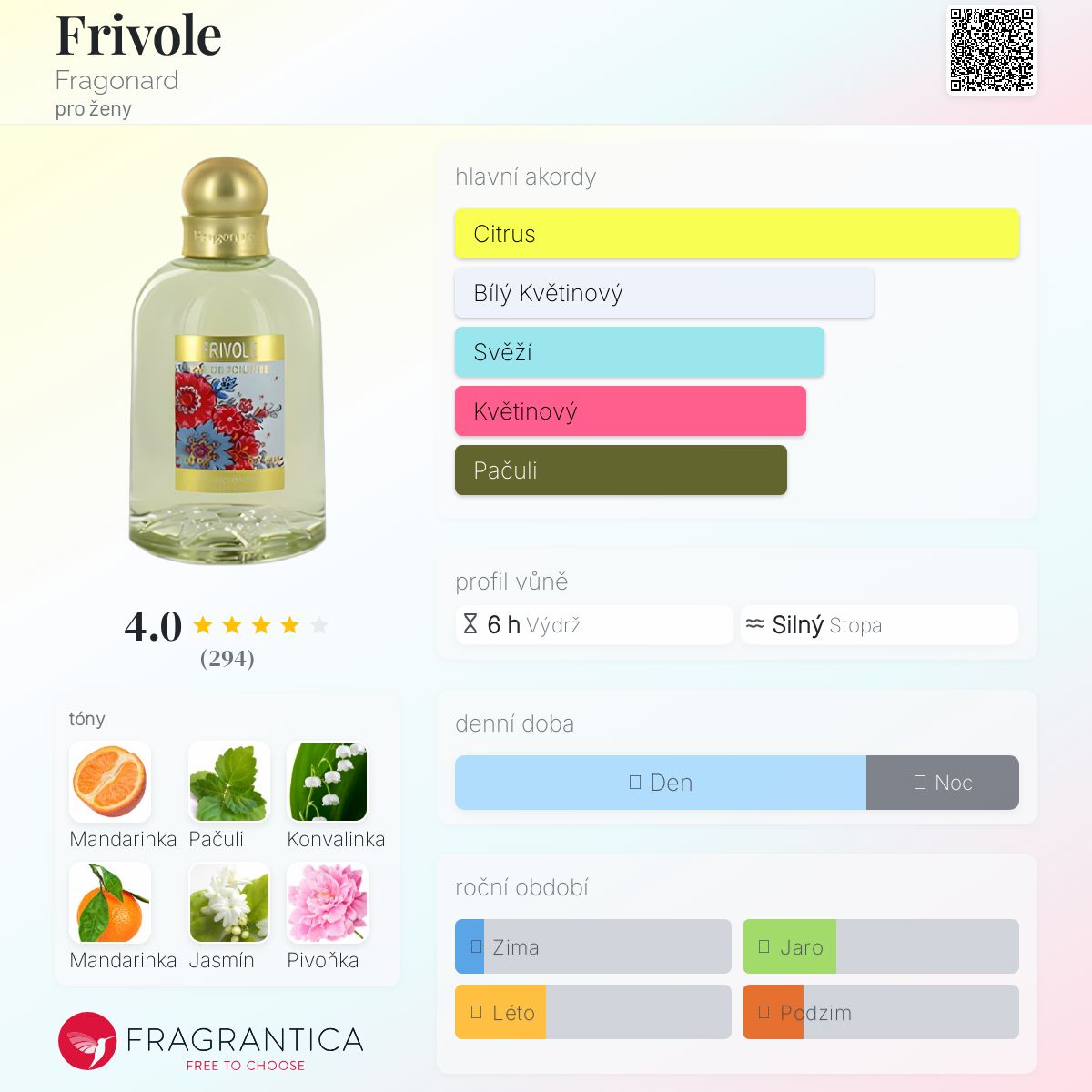 Frivole podle Fragonard je Floral Fruity vůně pro ženy. Frivole byl/a uveden/a v roce 2012. Vrchní tóny jsou Mandarinka, Mandarinka, Citrón a Bergamot; střední tóny jsouKonvalinka, Jasmín a Pivoňka ; základní tóny jsou Pačuli a Kosatec.