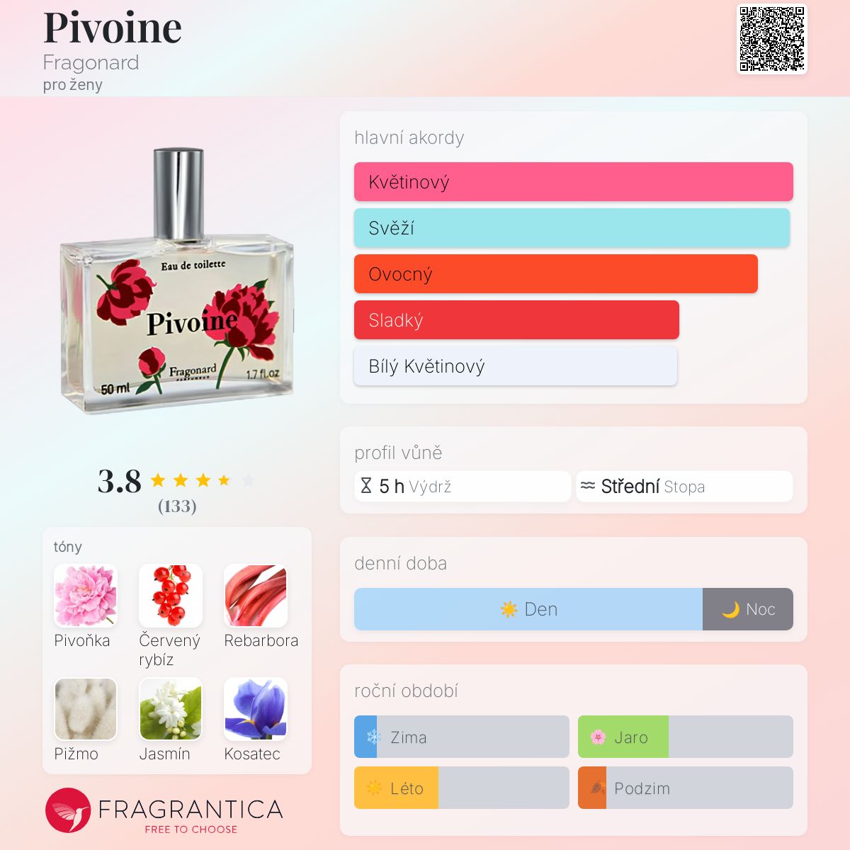 Pivoine podle Fragonard je Floral vůně pro ženy. Pivoine byl/a uveden/a v roce 2017. "Nosem" za touto vůní je Céline Ellena. Vrchní tóny jsou Červený rybíz, Rebarbora a Pustoryl; střední tóny jsouRůžová pivoňka, Červená pivoňka, Pivoňka, Jasmín a Mimóza ; základní tóny jsou Pižmo, Kosatec a Jantar (ambra).