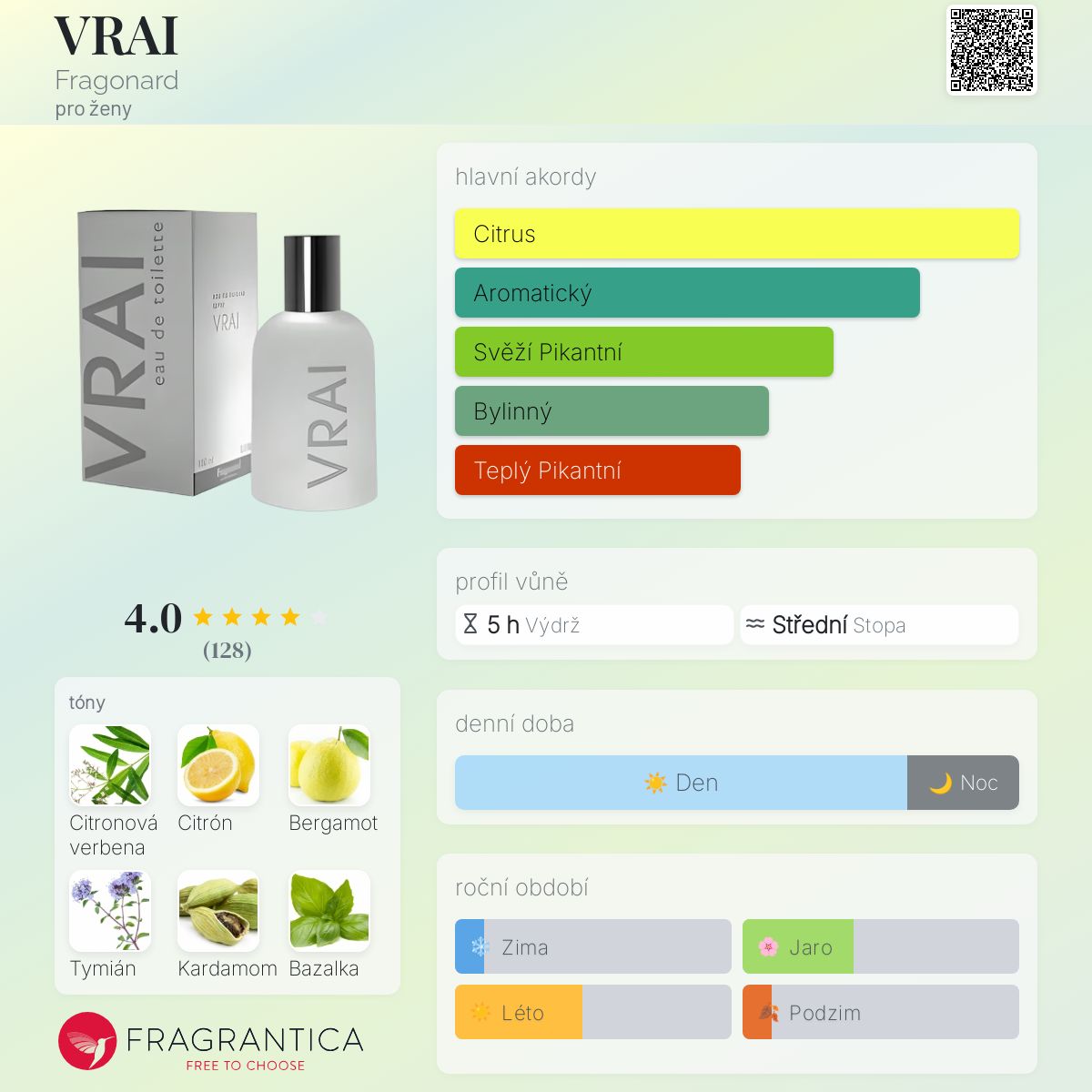VRAI podle Fragonard je Chypre vůně pro ženy. Vrchní tóny jsou Citronová verbena, Citron amalfi a Bergamot; střední tóny jsouKardamom a Bazalka ; základní tóny jsou Tymián, Jasmín a Dubový mech.