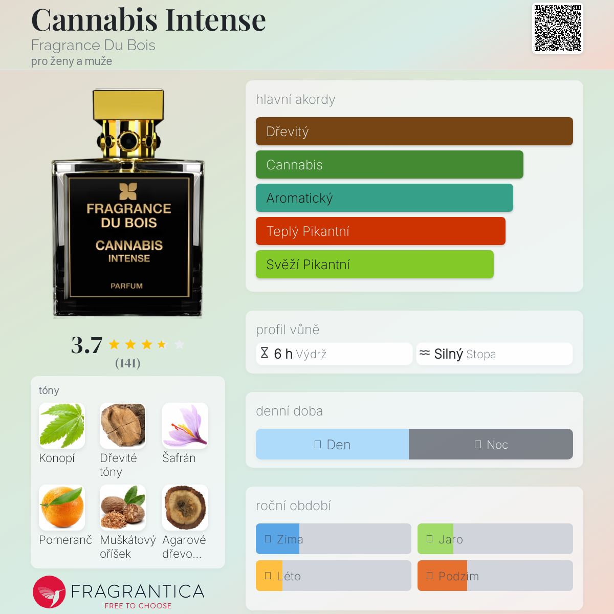 Cannabis Intense podle Fragrance Du Bois je Orientální Woody vůně pro ženy a muže. Cannabis Intense byl/a uveden/a v roce 2020. "Nosem" za touto vůní je Shadi Samra. Vrchní tóny jsou Pomeranč, Růžový pepř a Kardamom; střední tóny jsouKonopí, Šafrán a Muškátový oříšek ; základní tóny jsou Dřevité tóny, Agarové dřevo (oud), Cedr a Pižmo.