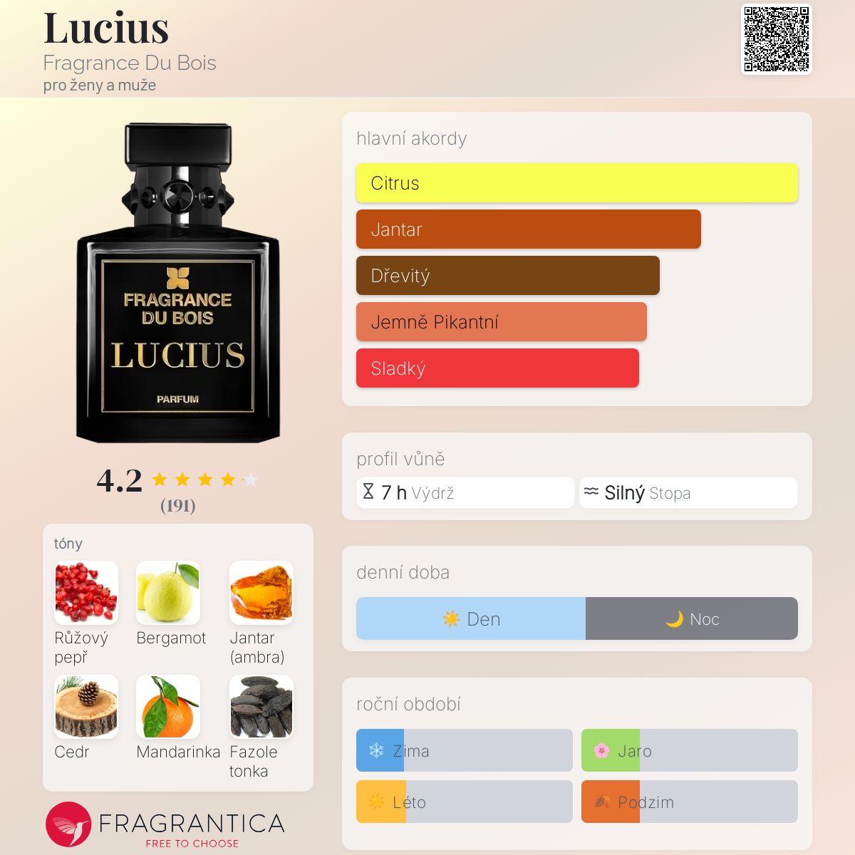 Lucius podle Fragrance Du Bois je Orientální vůně pro ženy a muže. Toto je nová vůně. Lucius byl/a uveden/a v roce 2024. Vrchní tóny jsou Růžový pepř, Bergamot a Mandarinka; střední tóny jsouCedr a Pomerančový květ ; základní tóny jsou Jantar (ambra) a Fazole tonka.