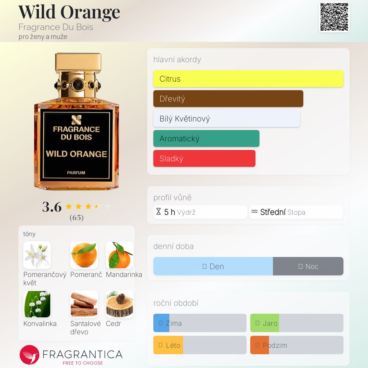 Wild Orange podle Fragrance Du Bois je Floral Aldehyde vůně pro ženy a muže. Wild Orange byl/a uveden/a v roce 2023. "Nosem" za touto vůní je Shadi Samra. Vrchní tóny jsou Pomeranč, Mandarinka, Citrón a Bergamot; střední tóny jsouPomerančový květ, Konvalinka a Cypřiš ; základní tóny jsou Santalové dřevo, Cedr, Pačuli a Vetiver.