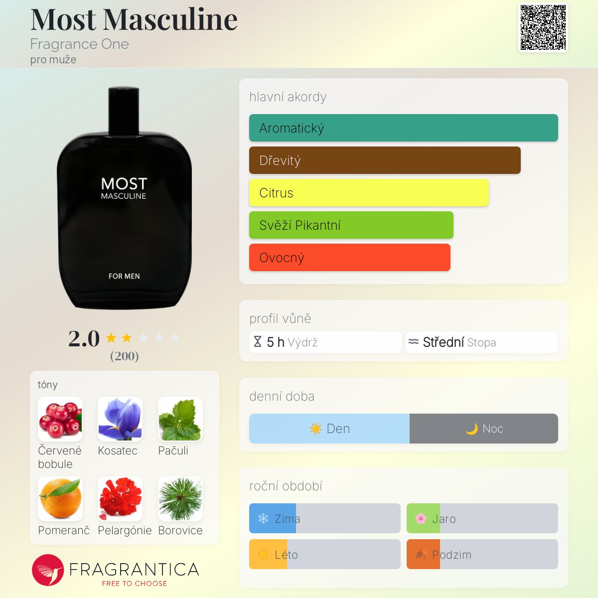Most Masculine podle Fragrance One je vůně pro muže. Toto je nová vůně. Most Masculine byl/a uveden/a v roce 2025.