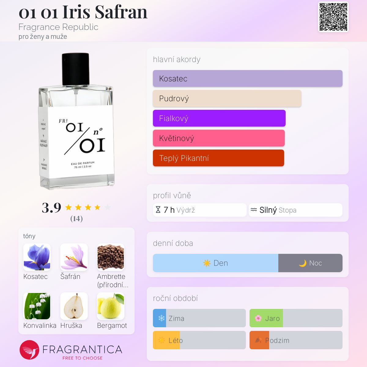 01 01 Iris Safran podle Fragrance Republic je Floral Woody Musk vůně pro ženy a muže. 01 01 Iris Safran byl/a uveden/a v roce 2013. "Nosem" za touto vůní je Nathalie Feisthauer. Vrchní tóny jsou Hruška a Bergamot; střední tóny jsouKosatec, Šafrán a Konvalinka ; základní tóny jsou Ambrette (přírodní pižmo), Vetiver a Pižmo.