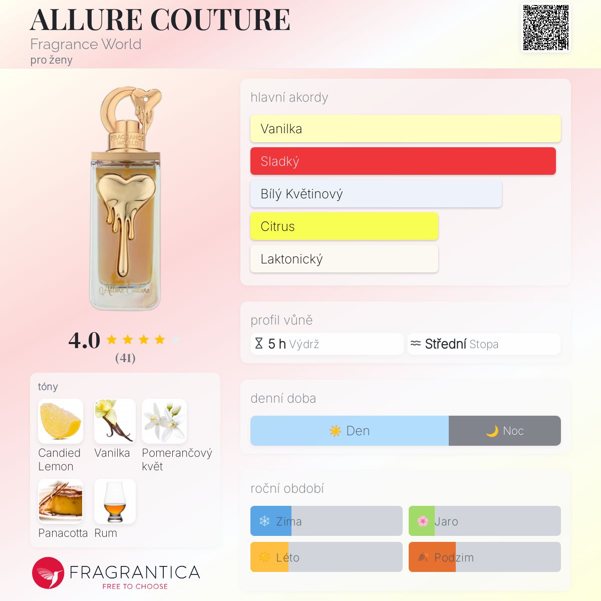 ALLURE COUTURE podle Fragrance World je Floral Fruity vůně pro ženy. Toto je nová vůně. ALLURE COUTURE byl/a uveden/a v roce 2025. Vrchní tón je Kandovaný citron ; střední tóny jsouPomerančový květ a Panacotta ; základní tóny jsou Vanilka a Rum.