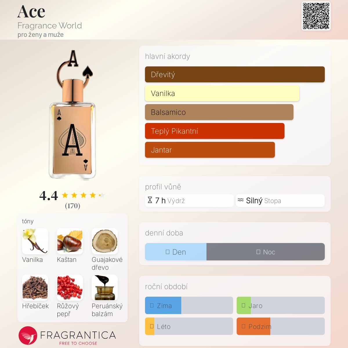 Ace podle Fragrance World je Orientální Vanilla vůně pro ženy a muže. Ace byl/a uveden/a v roce 2022. Vrchní tóny jsou Hřebíček, Růžový pepř a Pomerančový květ; střední tóny jsouKaštan, Guajakové dřevo a Jalovec ; základní tóny jsou Vanilka, Peruánský balzám a Kašmír.