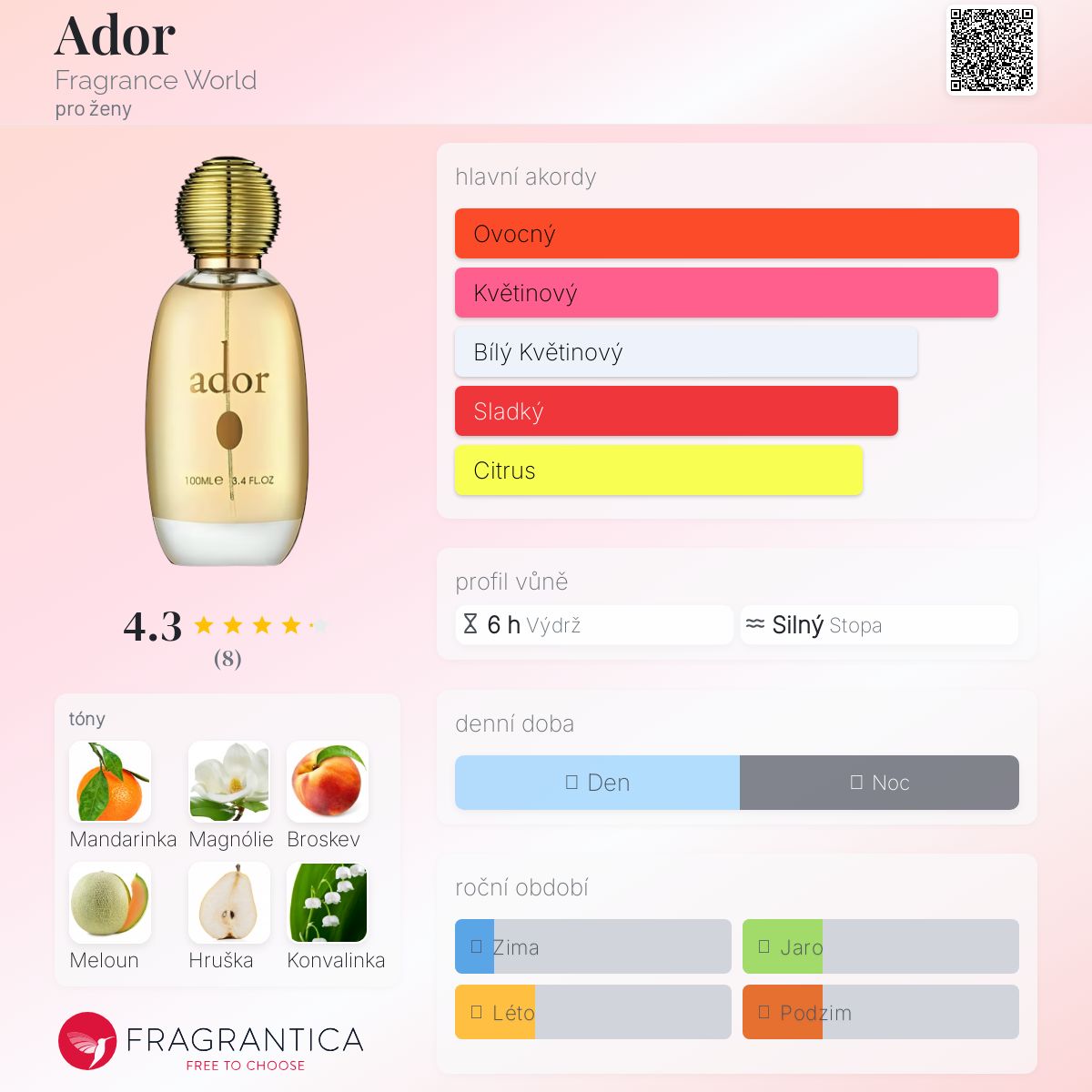 Ador podle Fragrance World je Floral Fruity vůně pro ženy. Ador byl/a uveden/a v roce 2022. Vrchní tóny jsou Mandarinka, Magnólie, Broskev, Meloun, Hruška a Bergamot; střední tóny jsouKonvalinka, Tuberóza, Jasmín, Frézie, Fialka, Orchidej, Růže a Švestka ; základní tóny jsou Ostružina, Vanilka, Cedr a Pižmo.