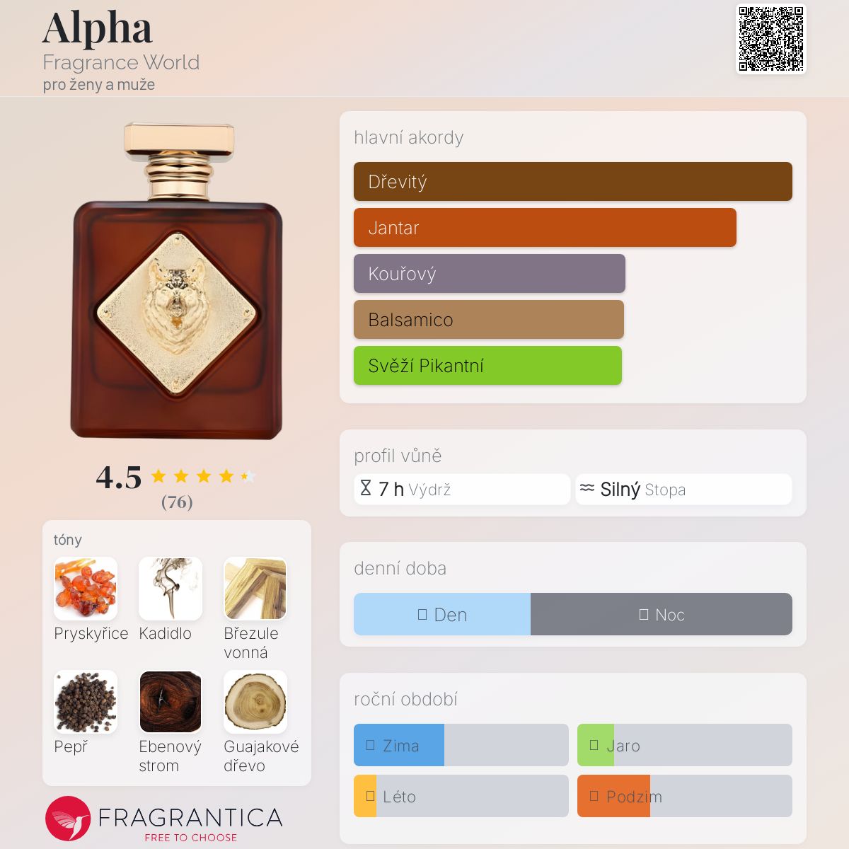 Alpha podle Fragrance World je Orientální Woody vůně pro ženy a muže. Alpha byl/a uveden/a v roce 2021. Vrchní tóny jsou Kadidlo, Březule vonná, Černý pepř a Fialkový list; střední tóny jsouKůže, Labdanum, Cade olej, Papyrus a Růže ; základní tóny jsou Pryskyřice, Ebenový strom a Guajakové dřevo.