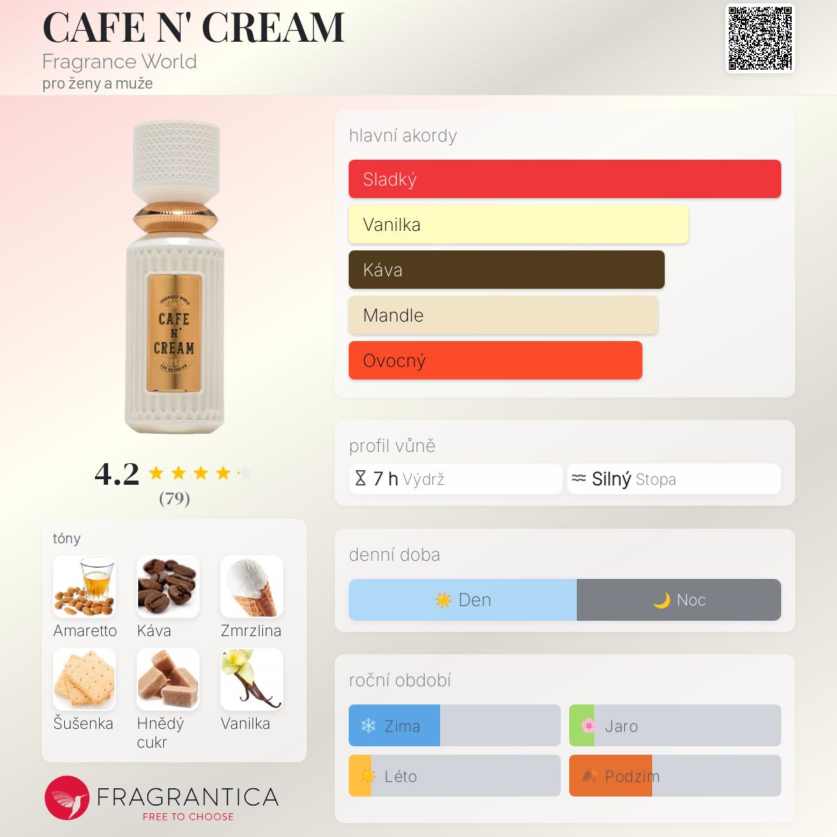 CAFE N' CREAM podle Fragrance World je Orientální Vanilla vůně pro ženy a muže. Toto je nová vůně. CAFE N' CREAM byl/a uveden/a v roce 2025. Vrchní tóny jsou Amaretto a Káva; střední tóny jsouZmrzlina, Sušenka a Vanilka ; základní tóny jsou Hnědý cukr, Vanilka a Jantar (ambra).