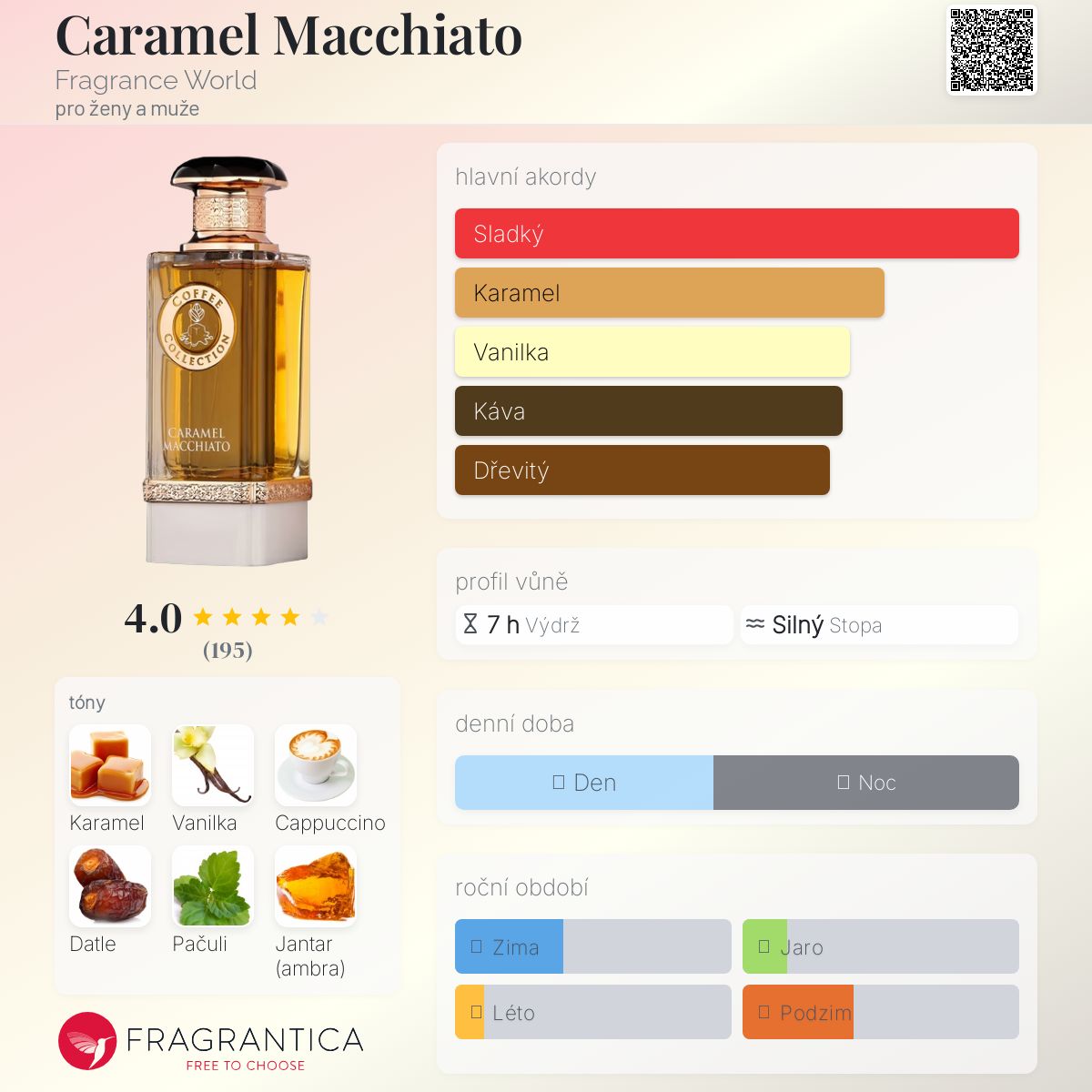 Caramel Macchiato podle Fragrance World je Orientální Vanilla vůně pro ženy a muže. Toto je nová vůně. Caramel Macchiato byl/a uveden/a v roce 2024. Vrchní tóny jsou Datle a Švestka; střední tóny jsouCappuccino, Pačuli a Cedr ; základní tóny jsou Karamel, Vanilka a Jantar (ambra).