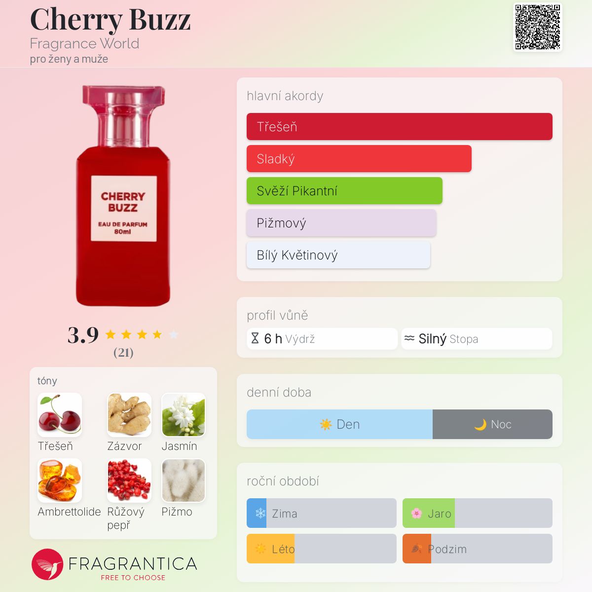 Cherry Buzz podle Fragrance World je Floral Fruity vůně pro ženy a muže. Cherry Buzz byl/a uveden/a v roce 2023. Vrchní tóny jsou Třešeň a Zázvor; střední tón jeJasmín Sambac ; základní tóny jsou Ambrettolide, Růžový pepř a Pižmo.