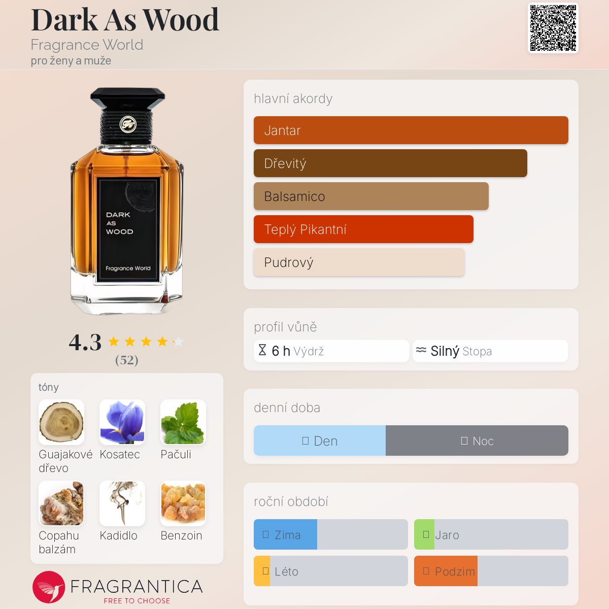 Dark As Wood podle Fragrance World je Orientální Woody vůně pro ženy a muže. Dark As Wood byl/a uveden/a v roce 2023. Vrchní tóny jsou Kosatec, Kadidlo a Růžový pepř; střední tóny jsouGuajakové dřevo, Benzoin a Koriandr ; základní tóny jsou Pačuli, Copahu balzám a Bílé pižmo.