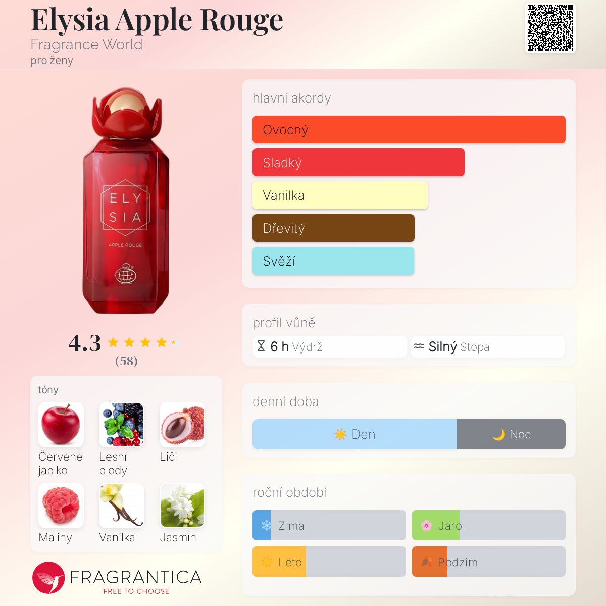 Elysia Apple Rouge podle Fragrance World je Floral Fruity Gourmand vůně pro ženy. Elysia Apple Rouge byl/a uveden/a v roce 2024. Vrchní tóny jsou Červené jablko, Liči, Černý rybíz a Růžový grapefruit; střední tóny jsouLesní plody, Maliny, Jasmín a Růže ; základní tóny jsou Vanilka, Cukr a Pižmo.