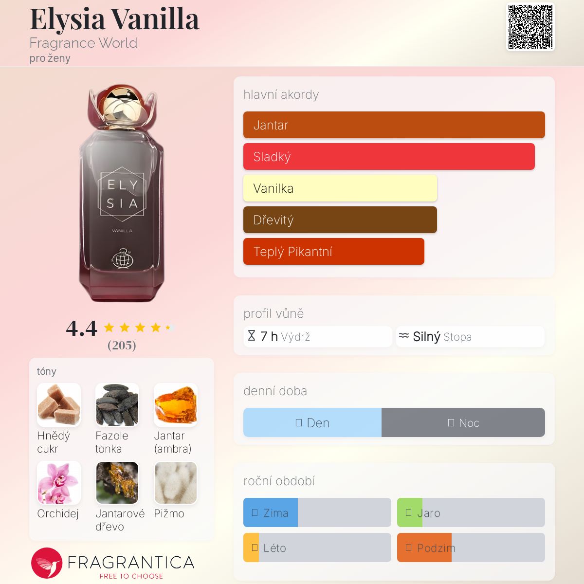 Elysia Vanilla podle Fragrance World je Orientální Vanilla vůně pro ženy. Elysia Vanilla byl/a uveden/a v roce 2023. Vrchní tóny jsou Vanilková orchidej a Jasmín; střední tóny jsouHnědý cukr a Fazole tonka ; základní tóny jsou Jantar (ambra), Jantarové dřevo, Pižmo a Pačuli.
