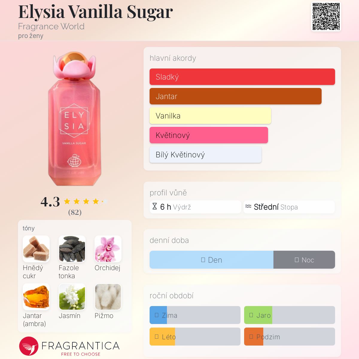 Elysia Vanilla Sugar podle Fragrance World je Orientální Vanilla vůně pro ženy. Elysia Vanilla Sugar byl/a uveden/a v roce 2024. Vrchní tóny jsou Vanilková orchidej a Jasmín; střední tóny jsouHnědý cukr a Fazole tonka ; základní tóny jsou Jantar (ambra), Pižmo, Jantarové dřevo a Pačuli.