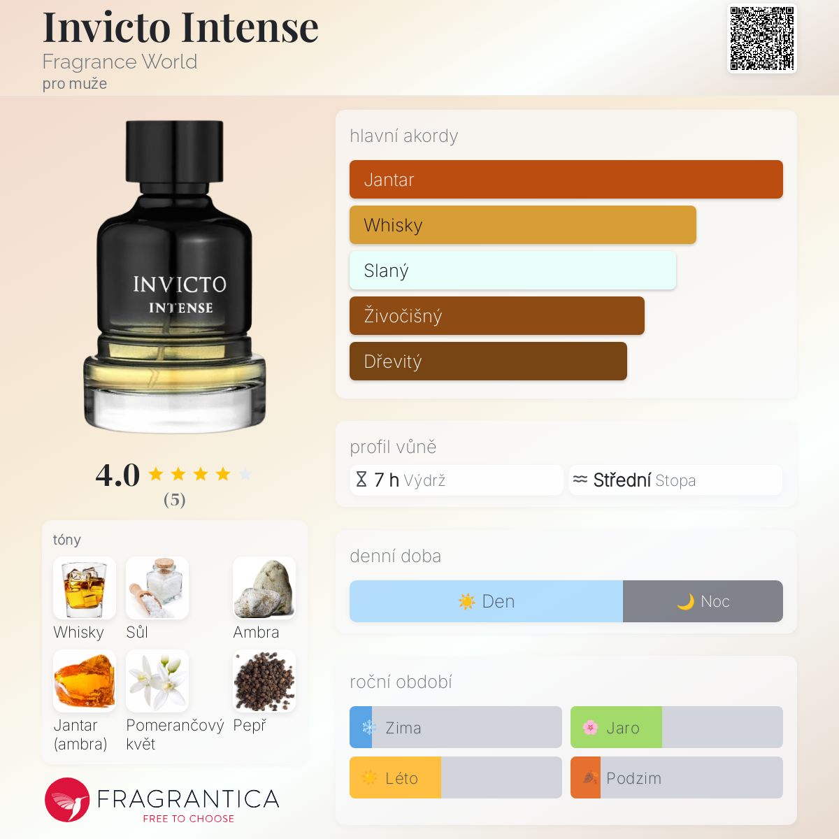 Invicto Intense podle Fragrance World je Orientální Woody vůně pro muže. Invicto Intense byl/a uveden/a v roce 2022. Vrchní tóny jsou Pomerančový květ a Černý pepř; střední tóny jsouWhisky a Bobkový list ; základní tóny jsou Sůl, Ambra a Jantar (ambra).