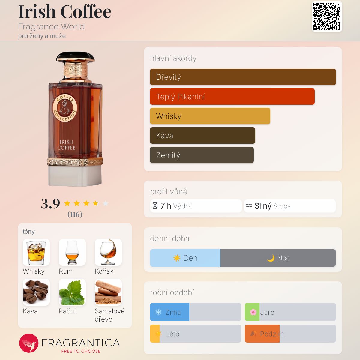 Irish Coffee podle Fragrance World je Woody Aromatic vůně pro ženy a muže. Toto je nová vůně. Irish Coffee byl/a uveden/a v roce 2024. Vrchní tóny jsou Pepř a Davana; střední tóny jsouRum, Káva, Otruby, Růže a Konvalinka ; základní tóny jsou Whisky, Koňak, Káva, Pačuli, Santalové dřevo, Dubový mech, Benzoin, Vanilka, Karamel a Cypriolový olej.