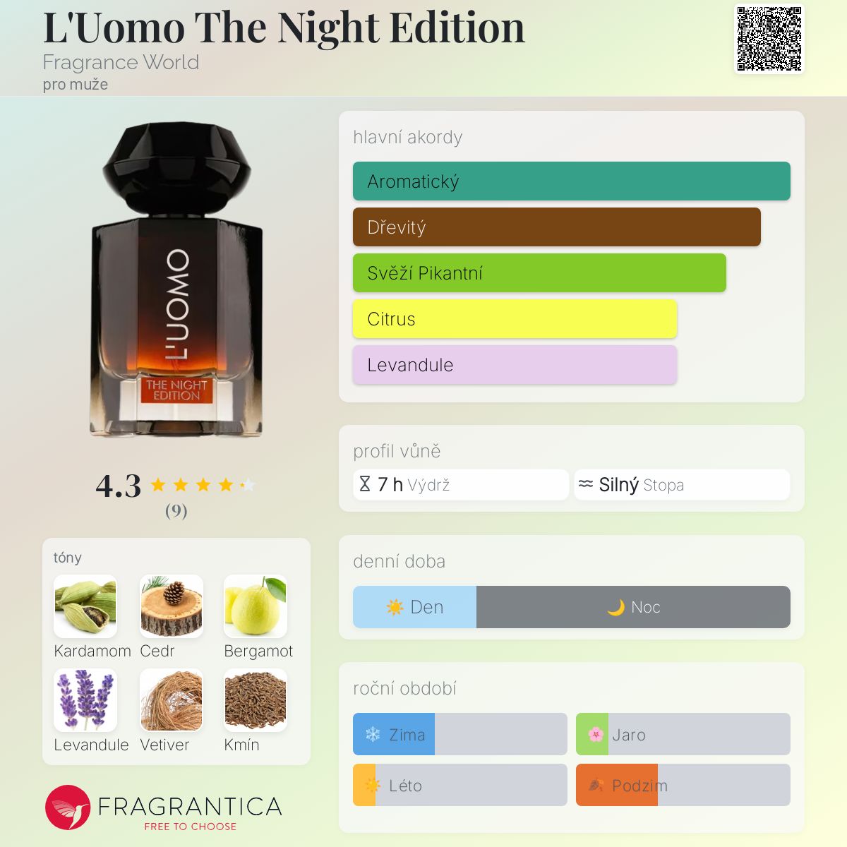 L'Uomo The Night Edition podle Fragrance World je Woody Spicy vůně pro muže. L'Uomo The Night Edition byl/a uveden/a v roce 2024. Vrchní tón je Kardamom ; střední tóny jsouVirginský cedr, Bergamot a Levandule ; základní tóny jsou Vetiver a Kmín.
