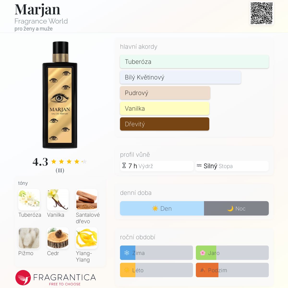 Marjan podle Fragrance World je Floral Woody Musk vůně pro ženy a muže. Marjan byl/a uveden/a v roce 2023. Vrchní tóny jsou Mandarinka a Pomerančový květ; střední tóny jsouTuberóza, Ylang-Ylang a Agáve ; základní tóny jsou Vanilka, Santalové dřevo, Bílé pižmo a Cedr.