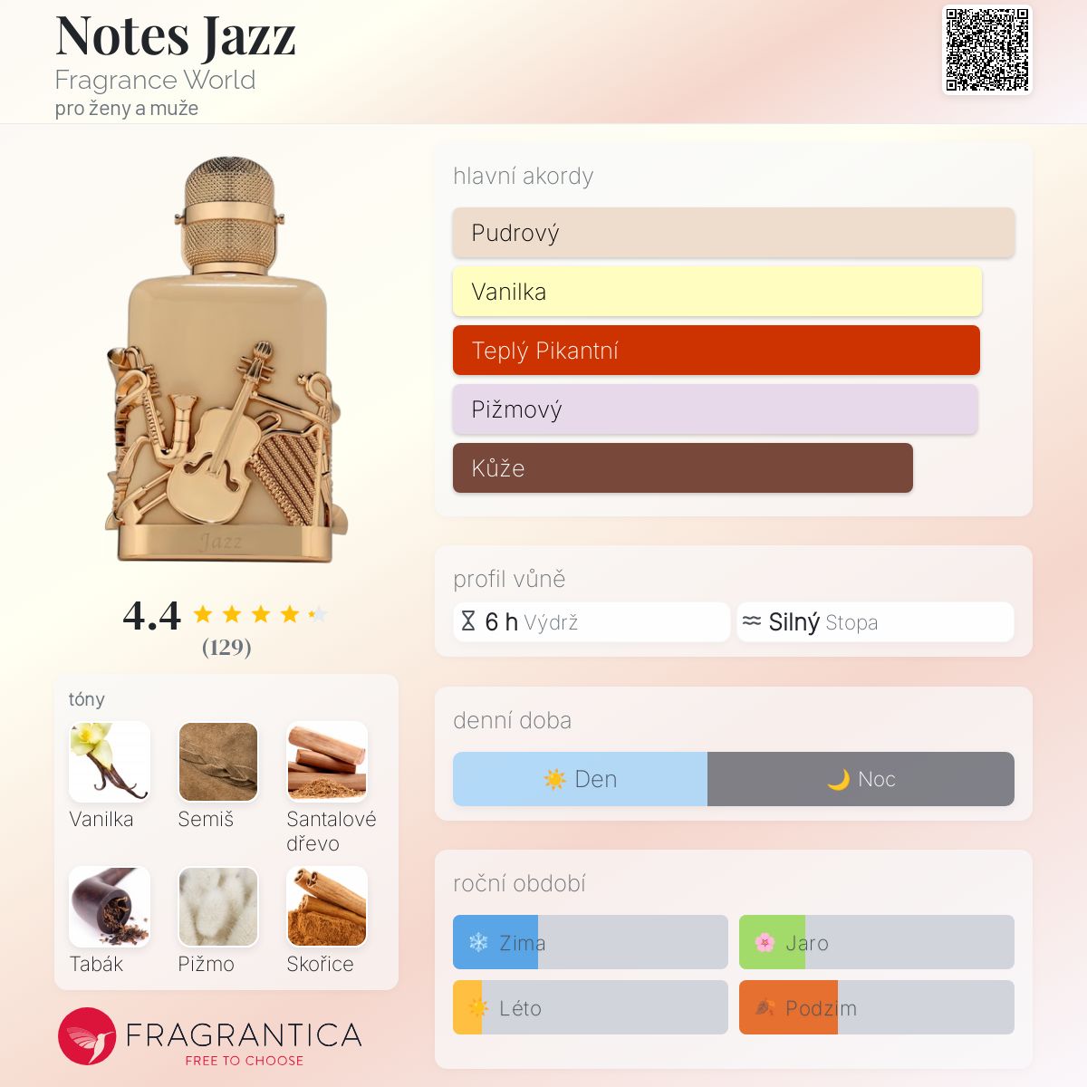 Notes Jazz podle Fragrance World je Orientální Vanilla vůně pro ženy a muže. Toto je nová vůně. Notes Jazz byl/a uveden/a v roce 2025. "Nosem" za touto vůní je Shinichiro Oba. Vrchní tóny jsou Skořice a Šafrán; střední tóny jsouSemiš, Ylang-Ylang a Jasmín ; základní tóny jsou Vanilka, Santalové dřevo, Tabák, Pižmo a Olibanum.