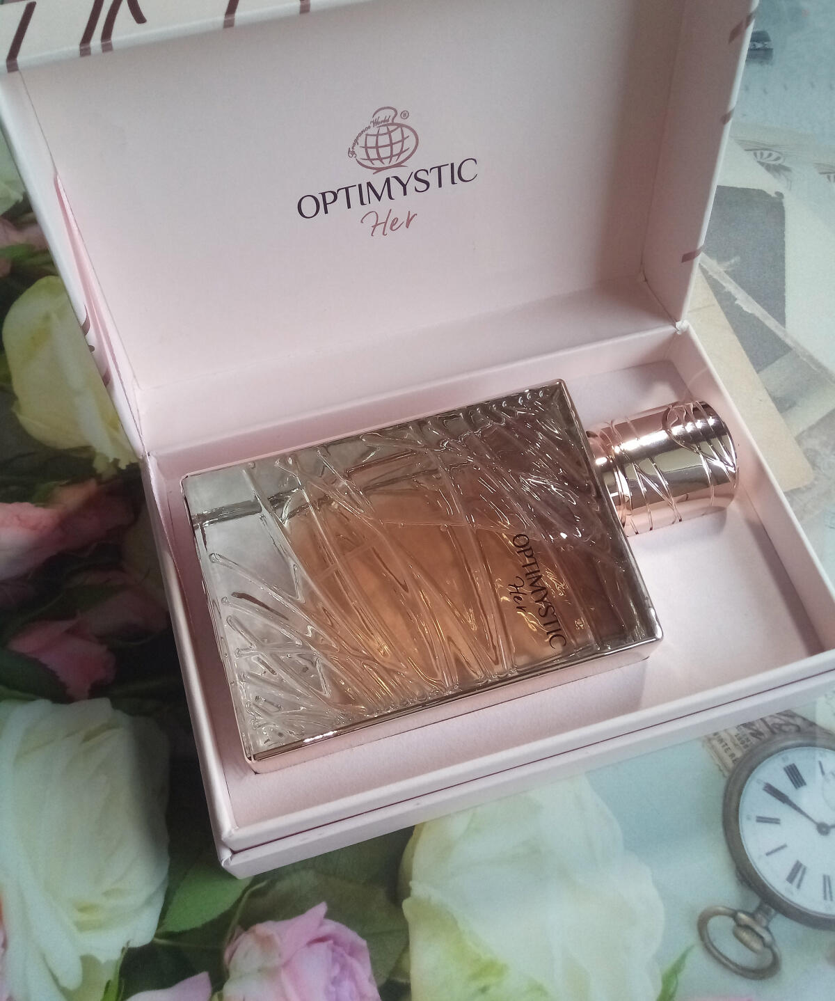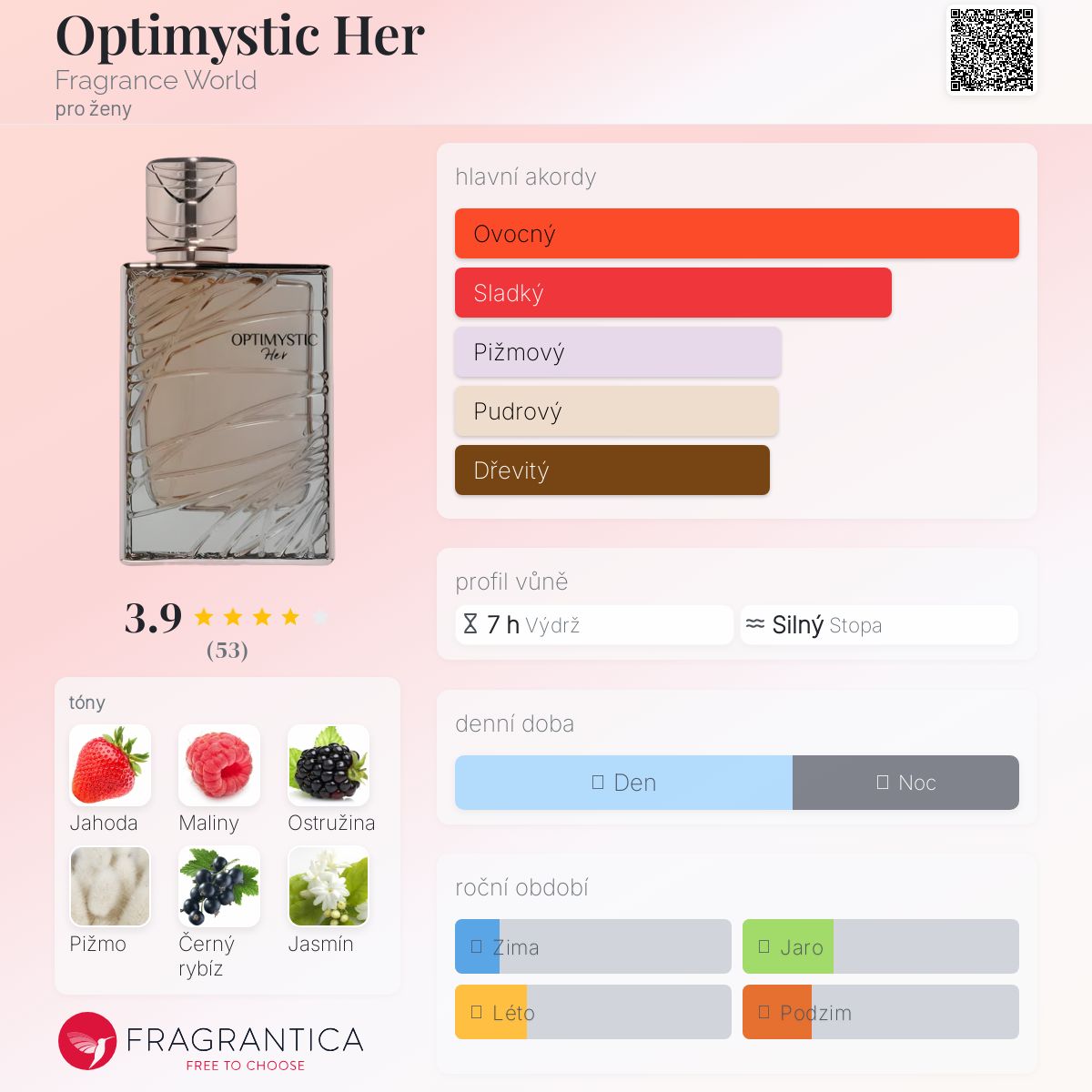 Optimystic Her podle Fragrance World je Floral Fruity vůně pro ženy. Optimystic Her byl/a uveden/a v roce 2022. Vrchní tóny jsou Jahoda, Maliny, Ostružina, Černý rybíz, Mandarinka, Kyselá třešeň a Citrón; střední tóny jsouJasmín a Fialka ; základní tóny jsou Pižmo, Vanilka, Kašmír, Dubový mech, Dřevité tóny, Pačuli a Jantar (ambra).