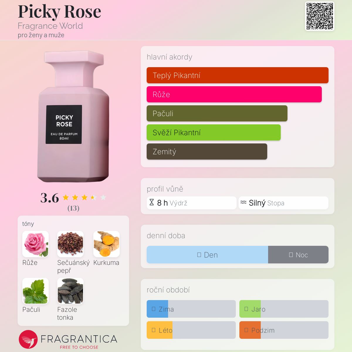 Picky Rose podle Fragrance World je Chypre vůně pro ženy a muže. Picky Rose byl/a uveden/a v roce 2020. Vrchní tóny jsou Sečuánský pepř a Kurkuma; střední tóny jsouBulharská růže, Turecká růže a Květná růže ; základní tóny jsou Pačuli a Fazole tonka.