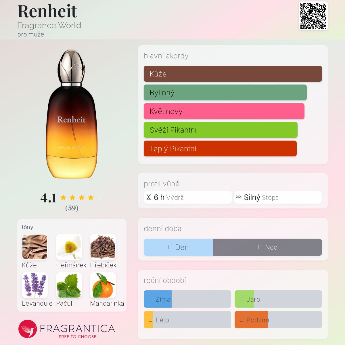 Renheit podle Fragrance World je Aromatic Spicy vůně pro muže. Renheit byl/a uveden/a v roce 2023. Vrchní tóny jsou Heřmánek, Levandule, Mandarinka, Hloh, Bergamot a Muškátový oříšek; střední tóny jsouHřebíček, Zimolez, Jasmín a Muškátový oříšek ; základní tóny jsou Kůže, Pačuli, Pižmo a Vetiver.