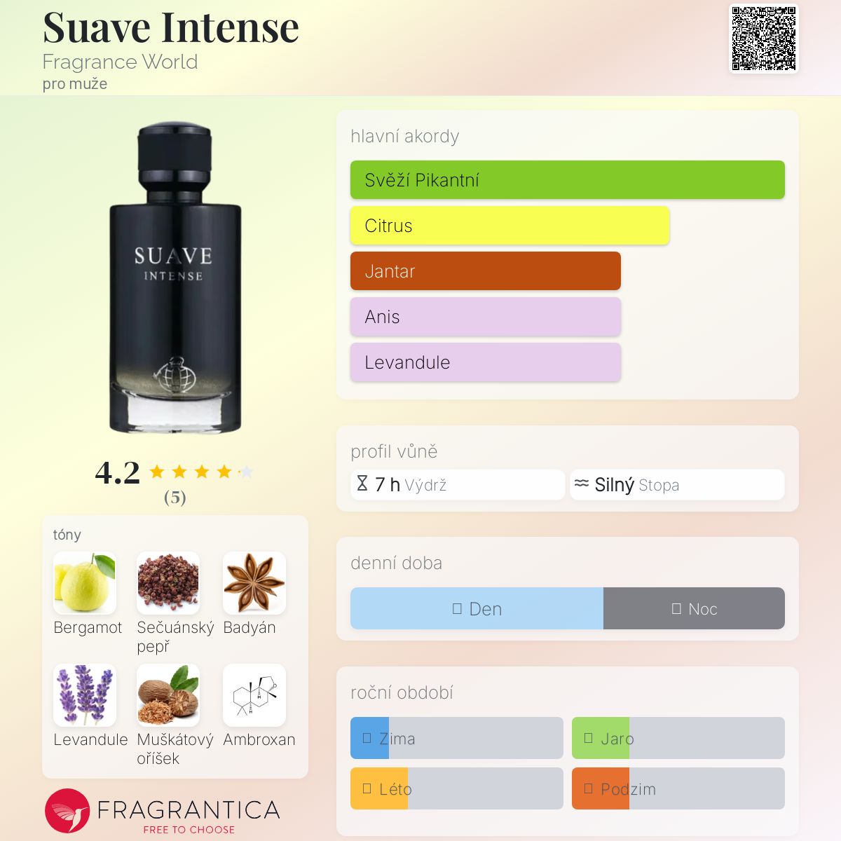 Suave Intense podle Fragrance World je vůně pro muže. Suave Intense byl/a uveden/a v roce 2021. Vrchní tóny jsou Kalábrijský bergamot a Sečuánský pepř; střední tóny jsouBadyán, Levandule a Muškátový oříšek ; základní tóny jsou Ambroxan a Vanilka.
