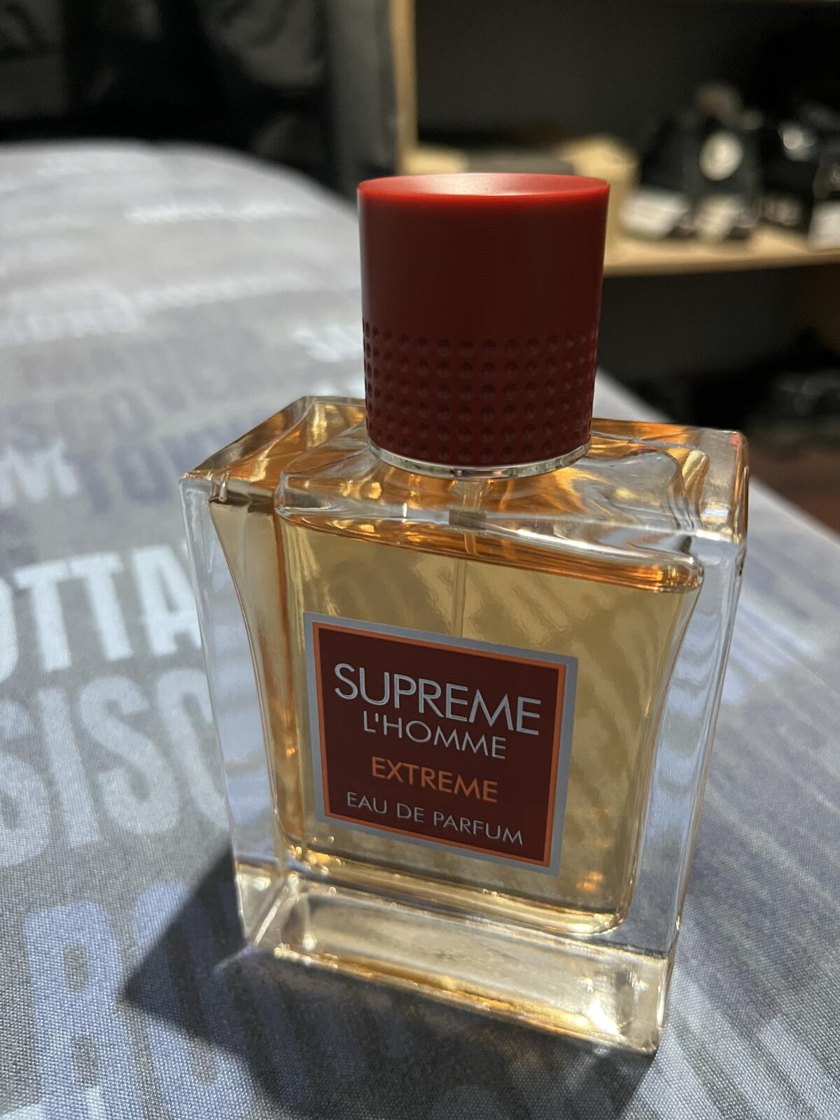 Supreme L'homme Extreme podle Fragrance World je Leather vůně pro ženy a muže. Vrchní tóny jsou Mandle, Růžový pepř a Bergamot; střední tóny jsouŠvestka, Skořice a Otočník ; základní tóny jsou Tabák, Kůže, Pačuli a Cedr.