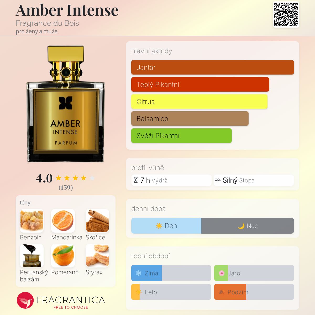 Amber Intense podle Fragrance du Bois je Orientální vůně pro ženy a muže. Amber Intense byl/a uveden/a v roce 2016. Vrchní tóny jsou Mandarinka, Skořice, Pomeranč, Kmín, Šafrán, Černý pepř a Bergamot; střední tóny jsouStyrax, Pačuli, Černý rybíz, Labdanum, Neroli, Jasmín a Růže ; základní tóny jsou Benzoin, Peruánský balzám, Pižmo a Agarové dřevo (oud).