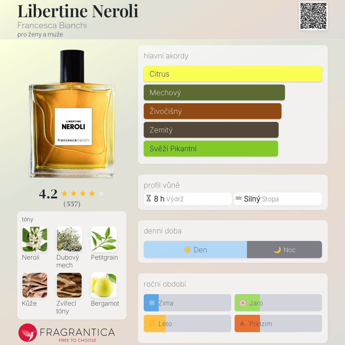 Libertine Neroli podle Francesca Bianchi je Chypre Floral vůně pro ženy a muže. Libertine Neroli byl/a uveden/a v roce 2022. "Nosem" za touto vůní je Francesca Bianchi. Vrchní tóny jsou Petitgrain a Bergamot; střední tóny jsouTuniské neroli, Kosatec a Pelargónie ; základní tóny jsou Dubový mech, Kůže, Zvířecí tóny, Labdanum a Benzoin.