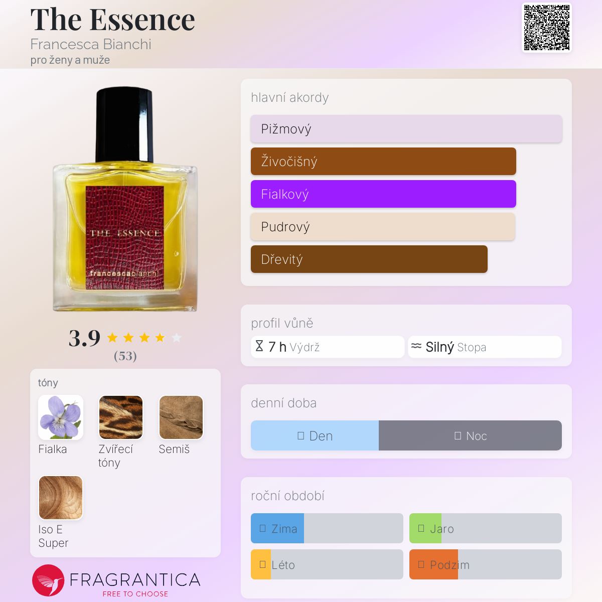 The Essence podle Francesca Bianchi je Woody Floral Musk vůně pro ženy a muže. Toto je nová vůně. The Essence byl/a uveden/a v roce 2025. "Nosem" za touto vůní je Francesca Bianchi.