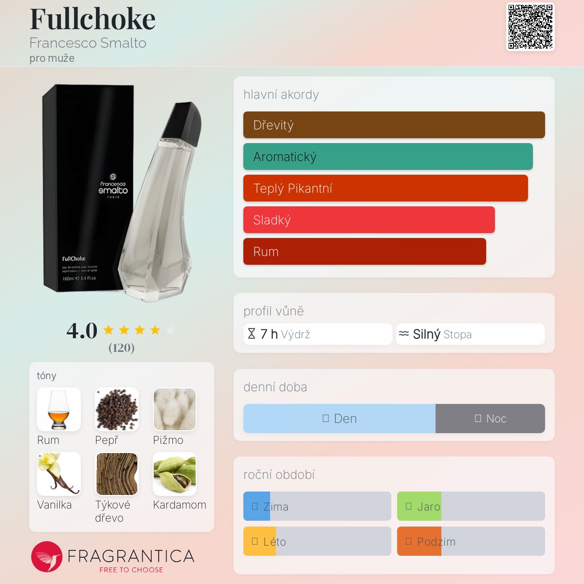 Fullchoke podle Francesco Smalto je Woody Spicy vůně pro muže. Fullchoke byl/a uveden/a v roce 2004. "Nosem" za touto vůní je Pierre Bourdon. Vrchní tóny jsou Pepř, Kardamom, Ananas, Meloun a Koriandr; střední tóny jsouRůže, Jasmín a Konvalinka ; základní tóny jsou Rum, Pižmo, Vanilka, Týkové dřevo, Vetiver a Jantar (ambra).