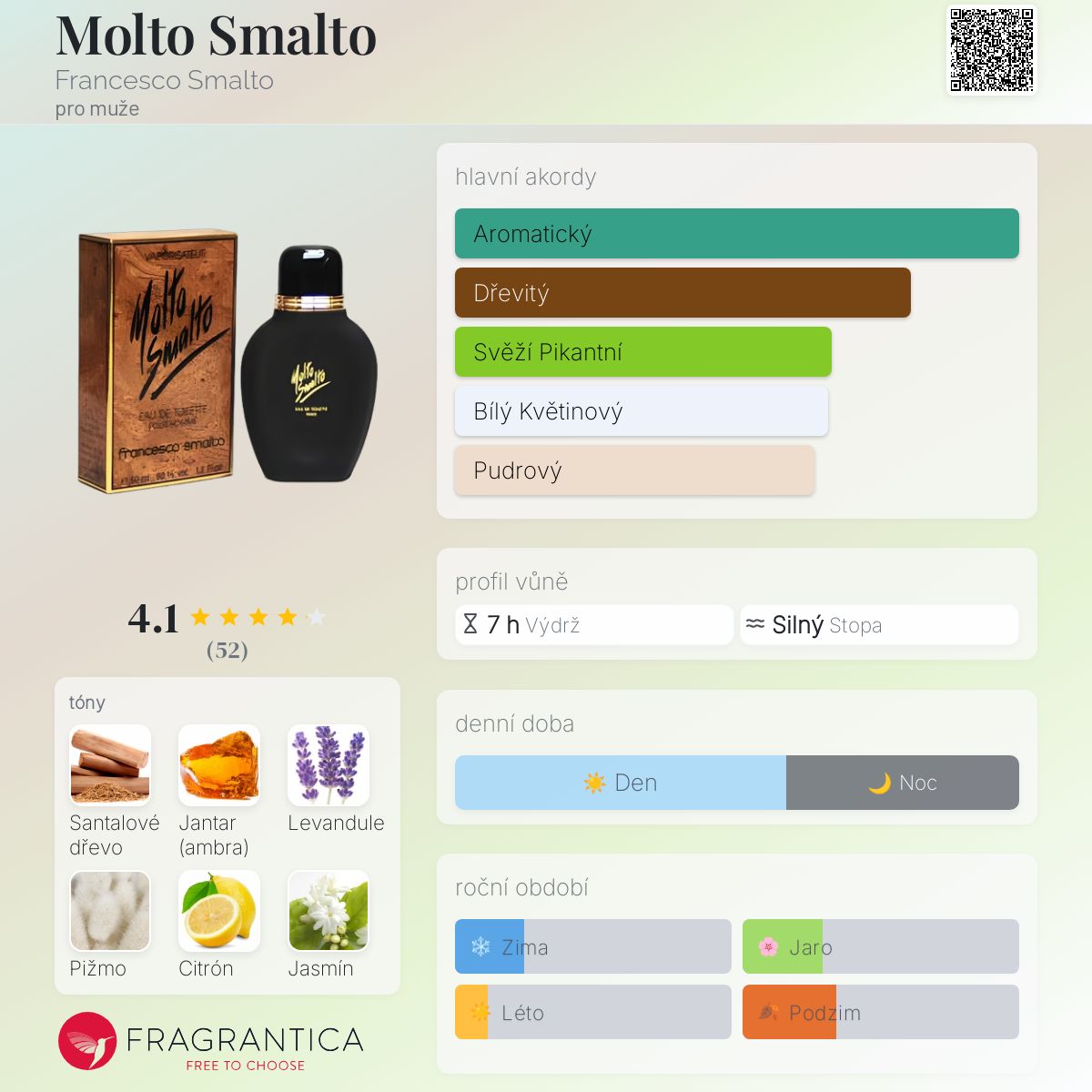 Molto Smalto podle Francesco Smalto je Chypre vůně pro muže. Molto Smalto byl/a uveden/a v roce 1993. Vrchní tóny jsou Levandule, Citron amalfi , Rozmarýn a Koriandr; střední tóny jsouJasmín, Šalvěj muškátová, Konvalinka a Pelargónie ; základní tóny jsou Santalové dřevo, Jantar (ambra), Pižmo a Virginský cedr.