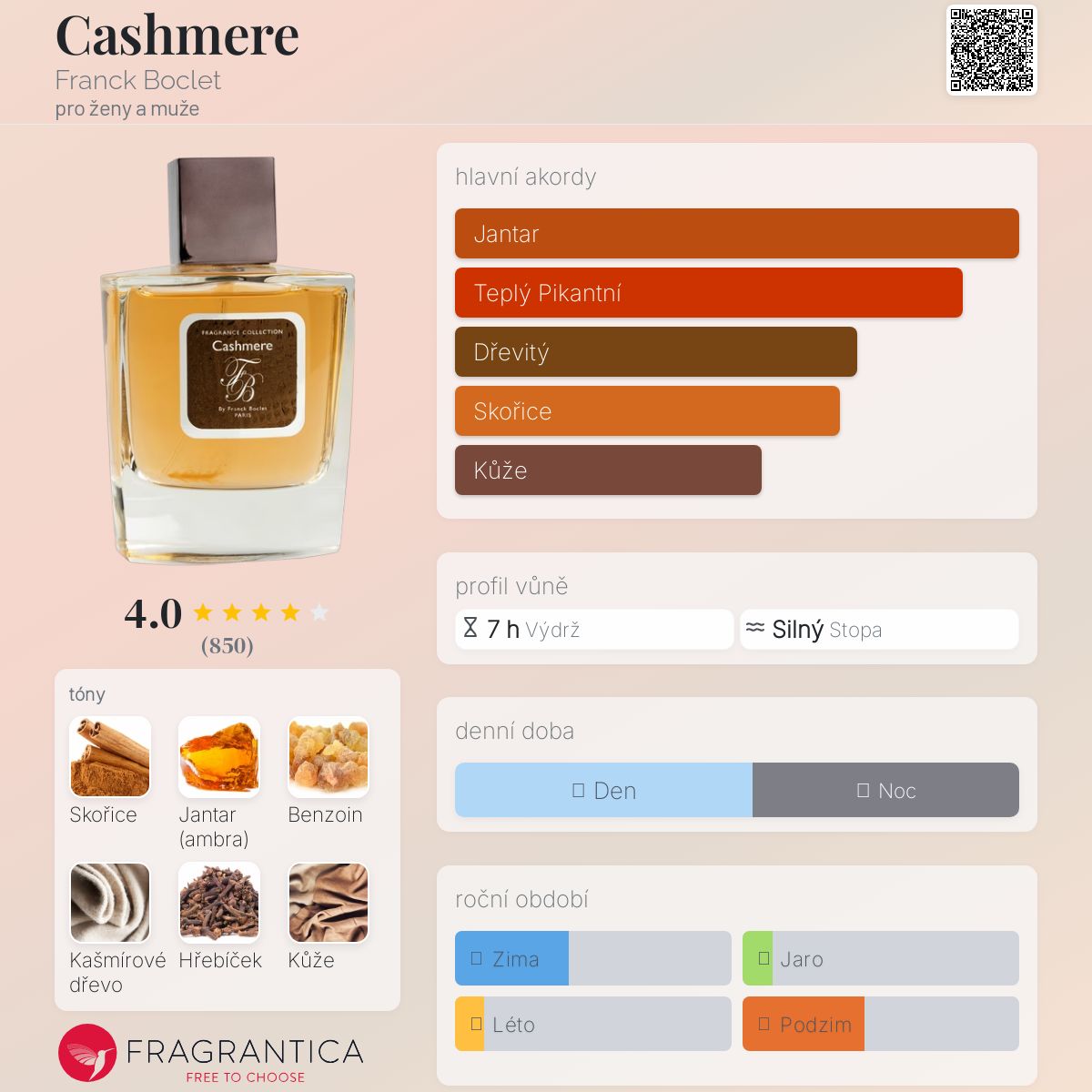 Cashmere podle Franck Boclet je Woody Spicy vůně pro ženy a muže. Cashmere byl/a uveden/a v roce 2017. Vrchní tóny jsou Grapefruit a Růžový pepř; střední tóny jsouSkořice, Hřebíček a Kůže ; základní tóny jsou Jantar (ambra), Benzoin, Kašmírové dřevo, Cedr a Vetiver.