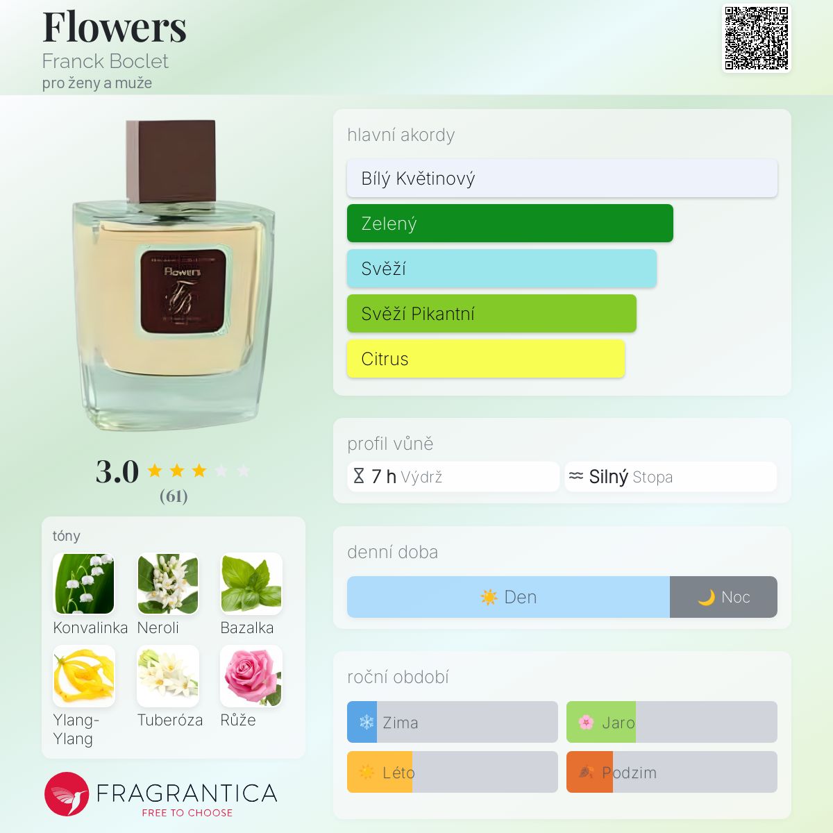Flowers podle Franck Boclet je Floral vůně pro ženy a muže. Flowers byl/a uveden/a v roce 2018. "Nosem" za touto vůní je Bruno Herve. Vrchní tóny jsou Bazalka, Limetka a Bergamot; střední tóny jsouKonvalinka, Neroli, Tuberóza a Růže ; základní tóny jsou Ylang-Ylang, Pižmo a Santalové dřevo.