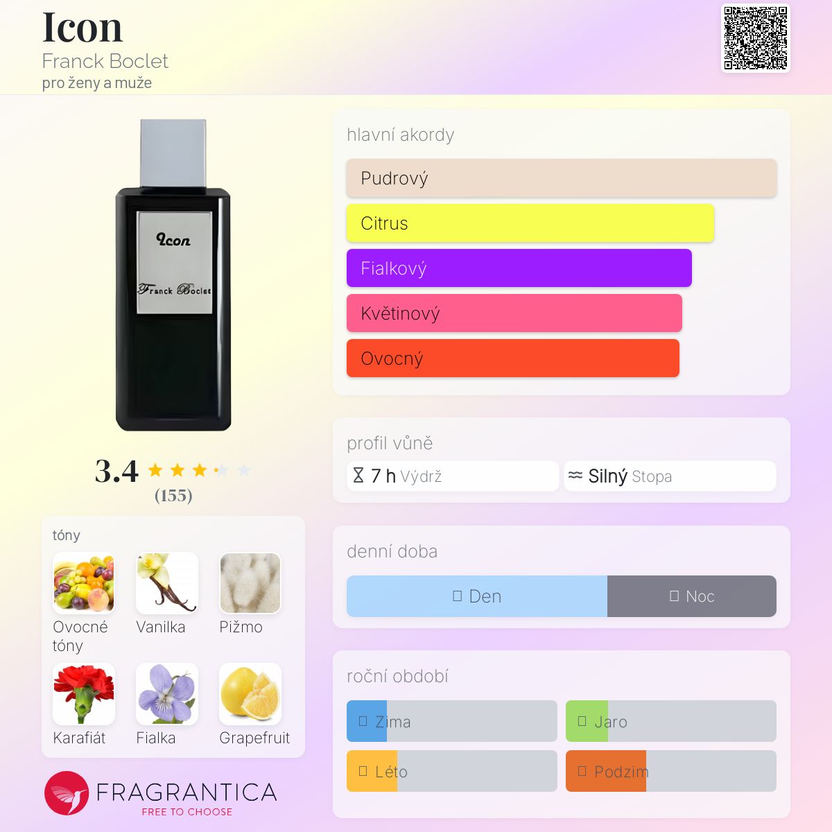 Icon podle Franck Boclet je vůně pro ženy a muže. Icon byl/a uveden/a v roce 2018. "Nosem" za touto vůní je Bruno Herve. Vrchní tóny jsou Grapefruit a Limetka; střední tóny jsouExotické ovoce, Fialka, Kosatec a Růže ; základní tóny jsou Vanilka, Pižmo a Karafiát.