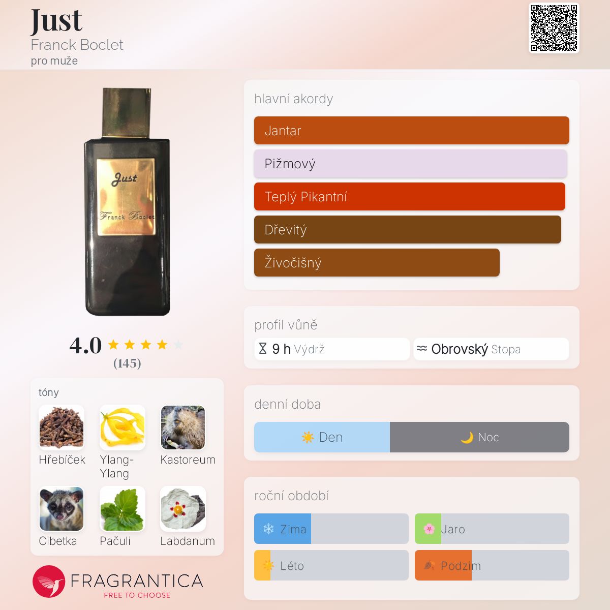 Just podle Franck Boclet je Orientální vůně pro muže. Just byl/a uveden/a v roce 2019. "Nosem" za touto vůní je Bruno Herve. Vrchní tóny jsou Bazalka, Citrón a Bergamot; střední tóny jsouHřebíček, Ylang-Ylang, Labdanum, Benzoin, Růže a Jasmín ; základní tóny jsou Kastoreum, Cibetka, Pačuli, Jantar (ambra), Pižmo a Cedr.