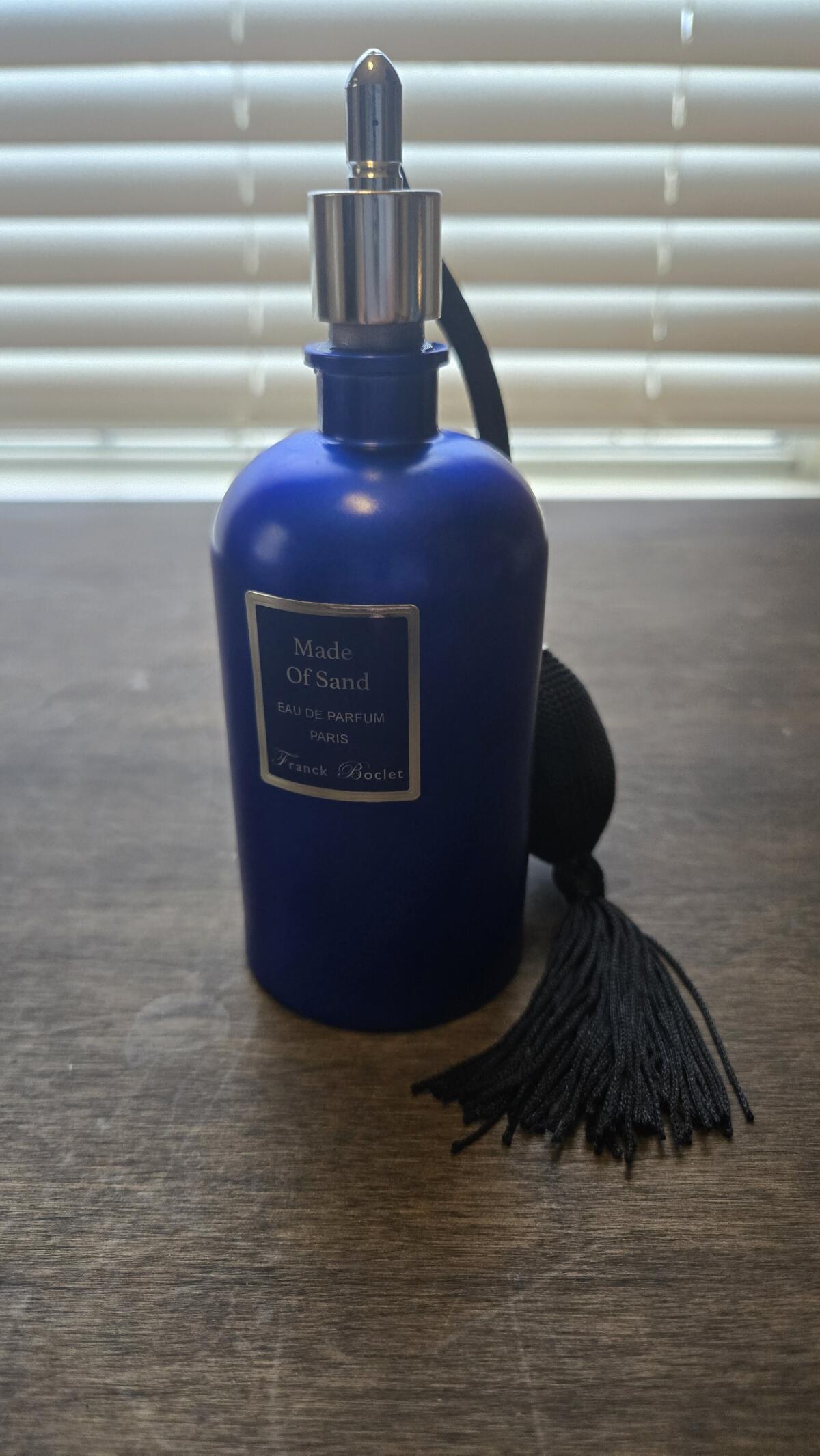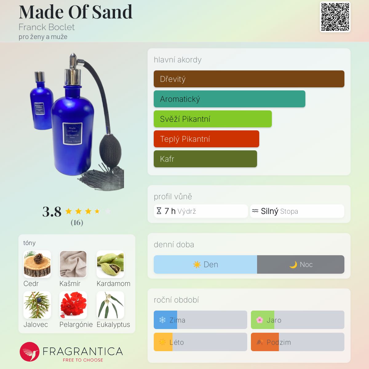 Made Of Sand podle Franck Boclet je vůně pro ženy a muže. Made Of Sand byl/a uveden/a v roce 2022. Vrchní tóny jsou Kardamom, Jalovec a Kafr; střední tóny jsouPelargónie, Eukalyptus a Naplavené dříví ; základní tóny jsou Cedr, Kašmír, Vetiver a Dubový mech.