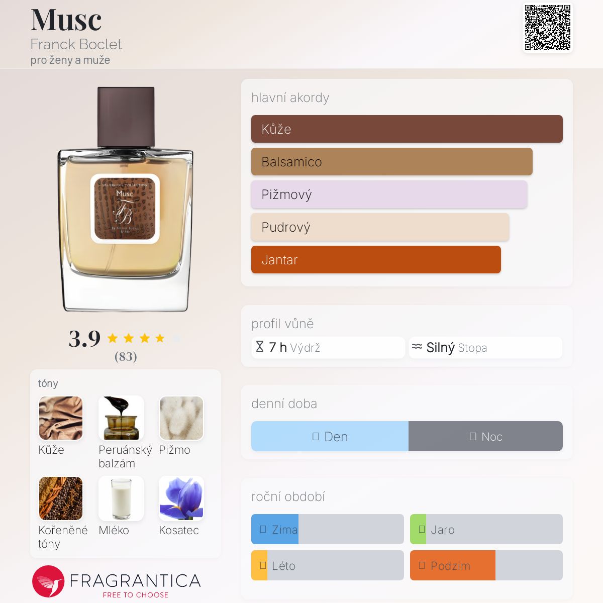 Musc podle Franck Boclet je Aromatic vůně pro ženy a muže. Musc byl/a uveden/a v roce 2016. "Nosem" za touto vůní je Fabienne Bourcier. Vrchní tóny jsou Pižmo a Koření; střední tóny jsouMléko, Kosatec a Růže ; základní tóny jsou Kůže, Peruánský balzám a Pižmo.
