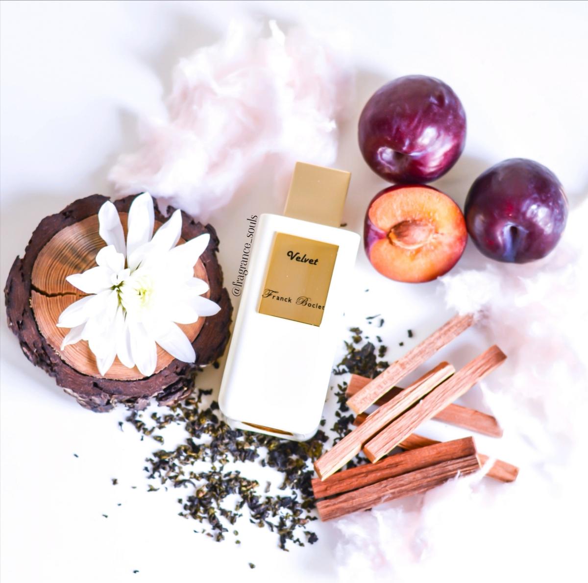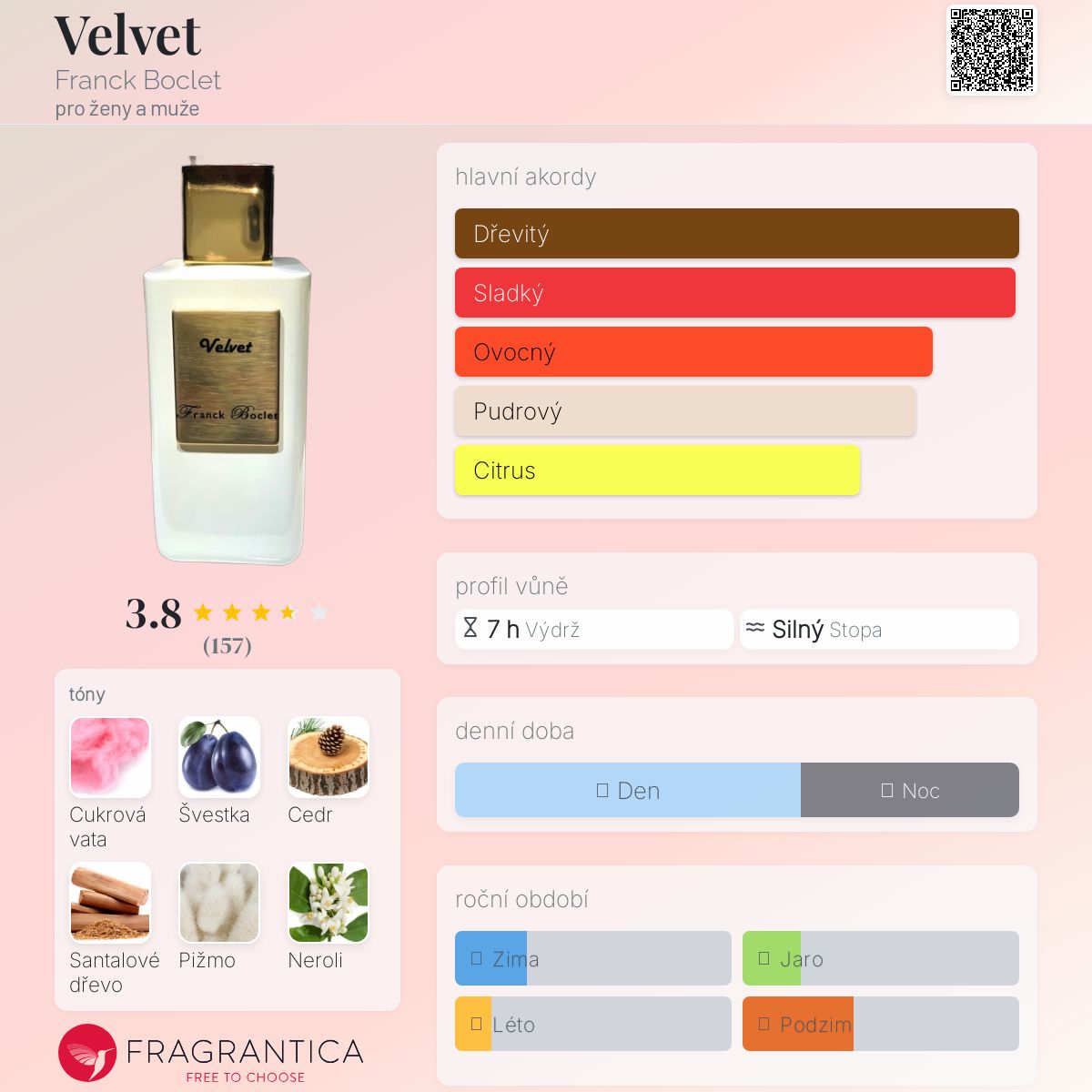 Velvet podle Franck Boclet je vůně pro ženy a muže. Velvet byl/a uveden/a v roce 2019. "Nosem" za touto vůní je Bruno Herve. Vrchní tóny jsou Bergamot a Pomeranč; střední tóny jsouSušené švestky, Neroli a Broskev ; základní tóny jsou Cukrová vata, Cedr, Santalové dřevo a Pižmo.