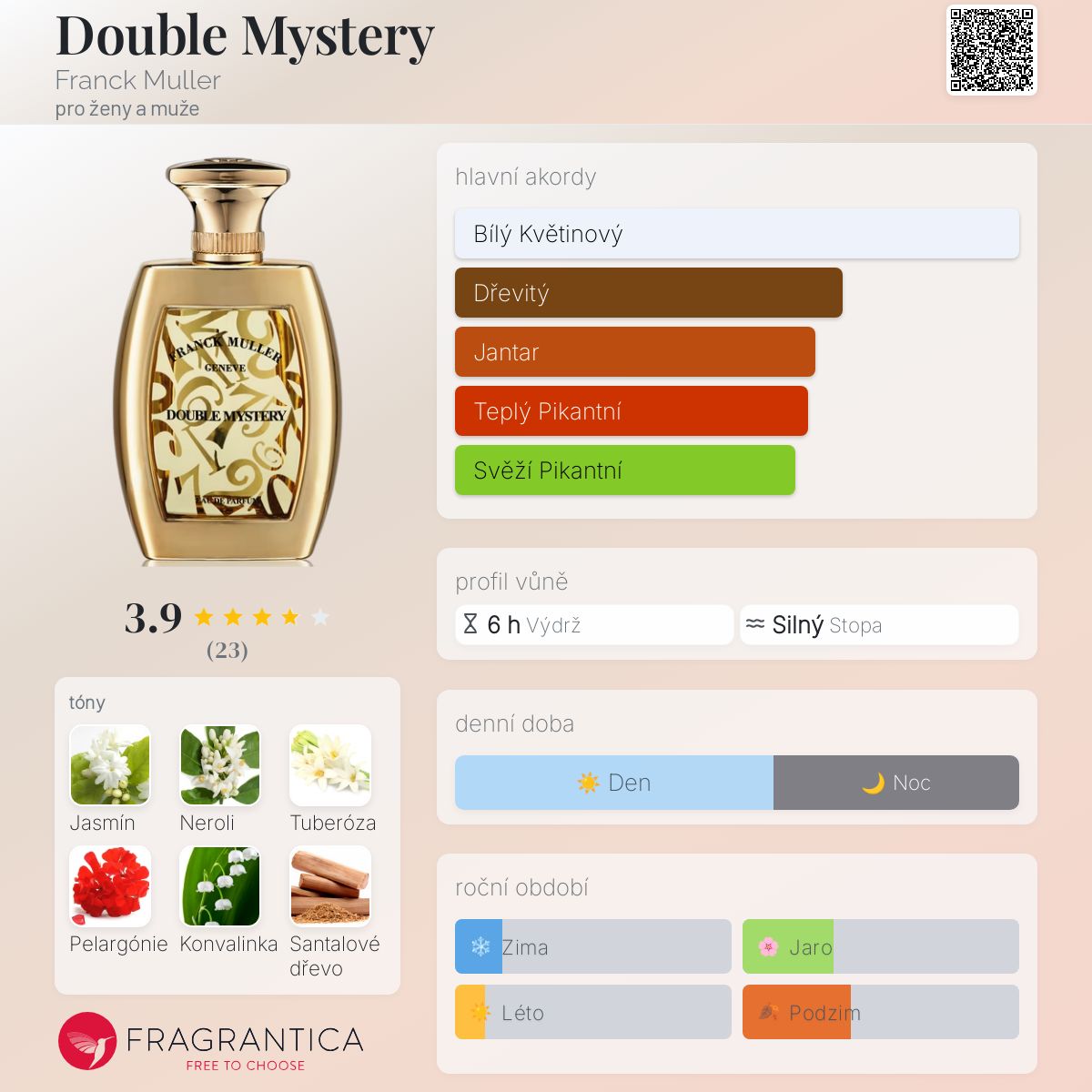 Double Mystery podle Franck Muller je Floral vůně pro ženy a muže. Double Mystery byl/a uveden/a v roce 2017. "Nosem" za touto vůní je Beverley Bayne. Vrchní tón je Bergamot ; střední tóny jsouJasmín Sambac, Neroli, Tuberóza, Pelargónie, Konvalinka, Kořen kosatce, Růže, Skořice, Muškátový oříšek a Citrusy ; základní tóny jsou Santalové dřevo, Myrha, Cedr, Labdanum, Kořen kosatce, Pačuli, Kadidlo, Pižmo, Šafrán, Dubový mech a Vanilka.
