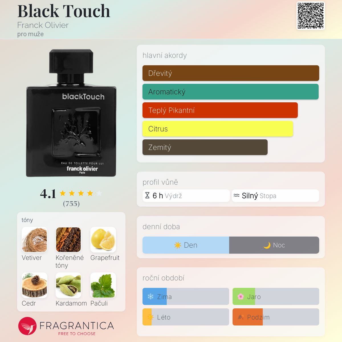 Black Touch podle Franck Olivier je Woody Spicy vůně pro muže. Black Touch byl/a uveden/a v roce 2009. Vrchní tóny jsou Koření, Grapefruit, Kardamom a Bergamot; střední tóny jsouPelargónie, Květ afrického pomeranče, Jasmín a Magnólie ; základní tóny jsou Vetiver, Virginský cedr, Pačuli, Pižmo a Vanilka.