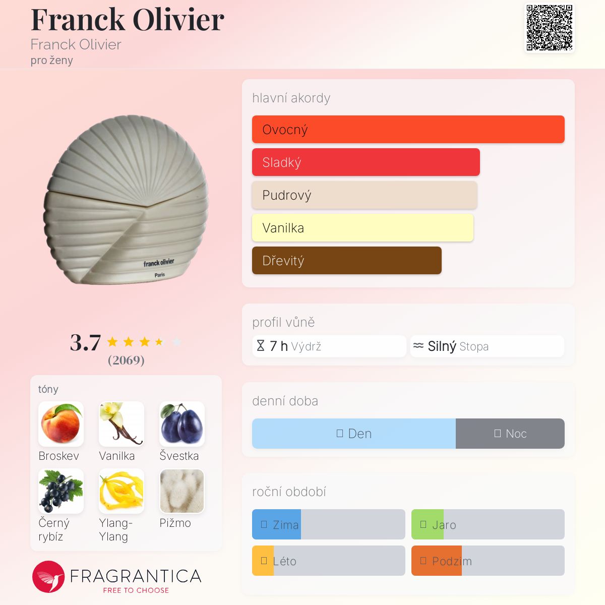 Franck Olivier podle Franck Olivier je Floral Fruity vůně pro ženy. Franck Olivier byl/a uveden/a v roce 1998. Vrchní tóny jsou Broskev, Švestka, Černý rybíz a Grapefruit; střední tóny jsouYlang-Ylang, Otočník, Jasmín a Růže ; základní tóny jsou Vanilka, Pižmo a Santalové dřevo.
