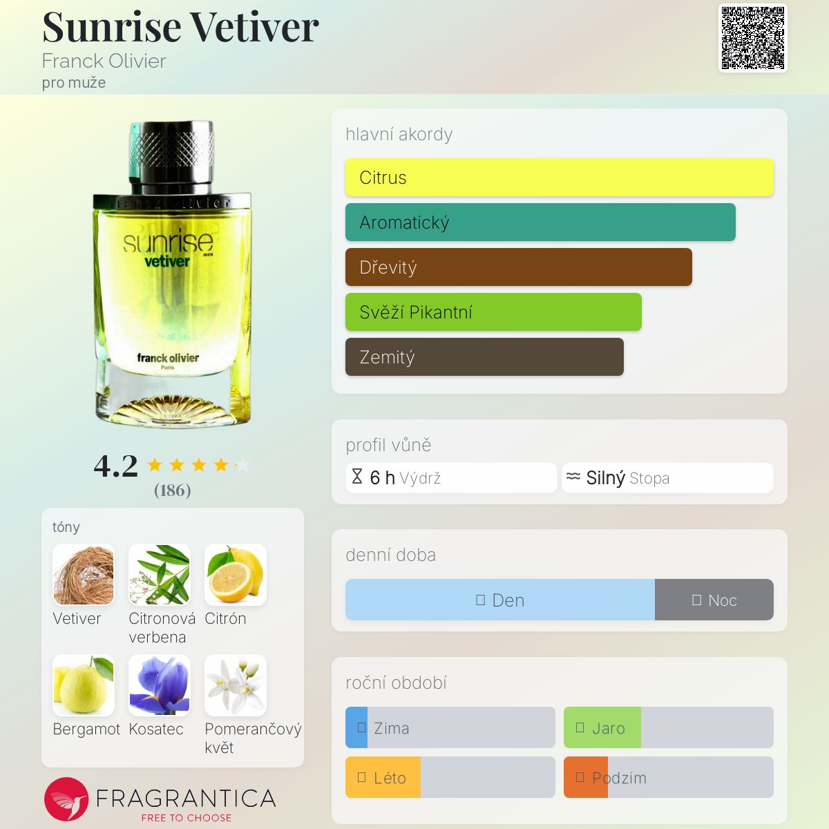 Sunrise Vetiver podle Franck Olivier je vůně pro muže. Vrchní tóny jsou Citronová verbena, Italský citrón, Bergamot a Pomerančový květ; střední tóny jsouMuškátový oříšek, Rozmarýn a Kardamom ; základní tóny jsou Vetiver, Kosatec, Santalové dřevo a Bílý jantar (ambra).