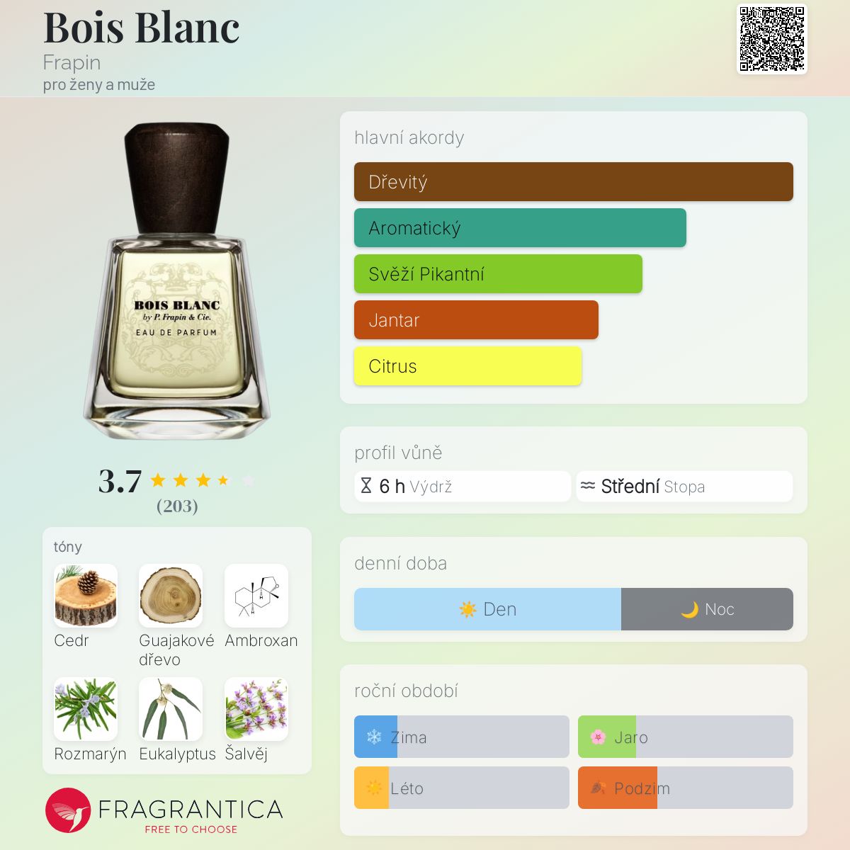 Bois Blanc podle Frapin je Woody vůně pro ženy a muže. Bois Blanc byl/a uveden/a v roce 2020. "Nosem" za touto vůní je Anne-Sophie Behaghel. Vrchní tóny jsou Rozmarýn, Eukalyptus, Zázvor, Hořký pomeranč a Mandarinka; střední tóny jsouVirginský cedr, Šalvěj a Fialkový list ; základní tóny jsou Guajakové dřevo, Ambroxan a Cade olej.