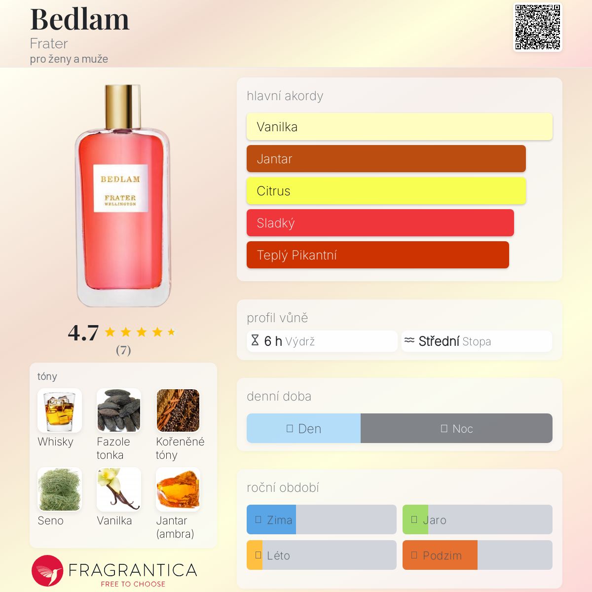 Bedlam podle Frater je vůně pro ženy a muže. Bedlam byl/a uveden/a v roce 2022. Vrchní tóny jsou Whisky, Yuzu a Divoký pomeranč; střední tóny jsouKoření, Seno a Pomerančový květ ; základní tóny jsou Fazole tonka, Vanilka, Jantar (ambra), Pižmo, Cedr a Pačuli.