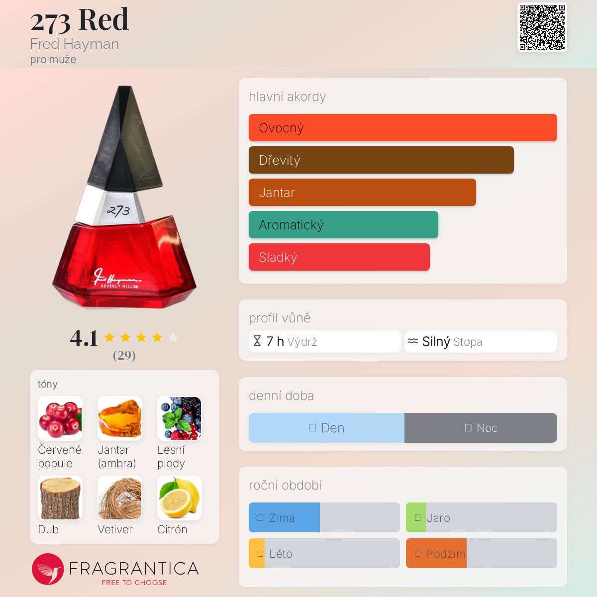 273 Red podle Fred Hayman je Woody Aromatic vůně pro muže. 273 Red byl/a uveden/a v roce 2004. Vrchní tón je Citrón ; střední tóny jsouČervené bobule a Lesní plody ; základní tóny jsou Jantar (ambra), Dub a Vetiver.