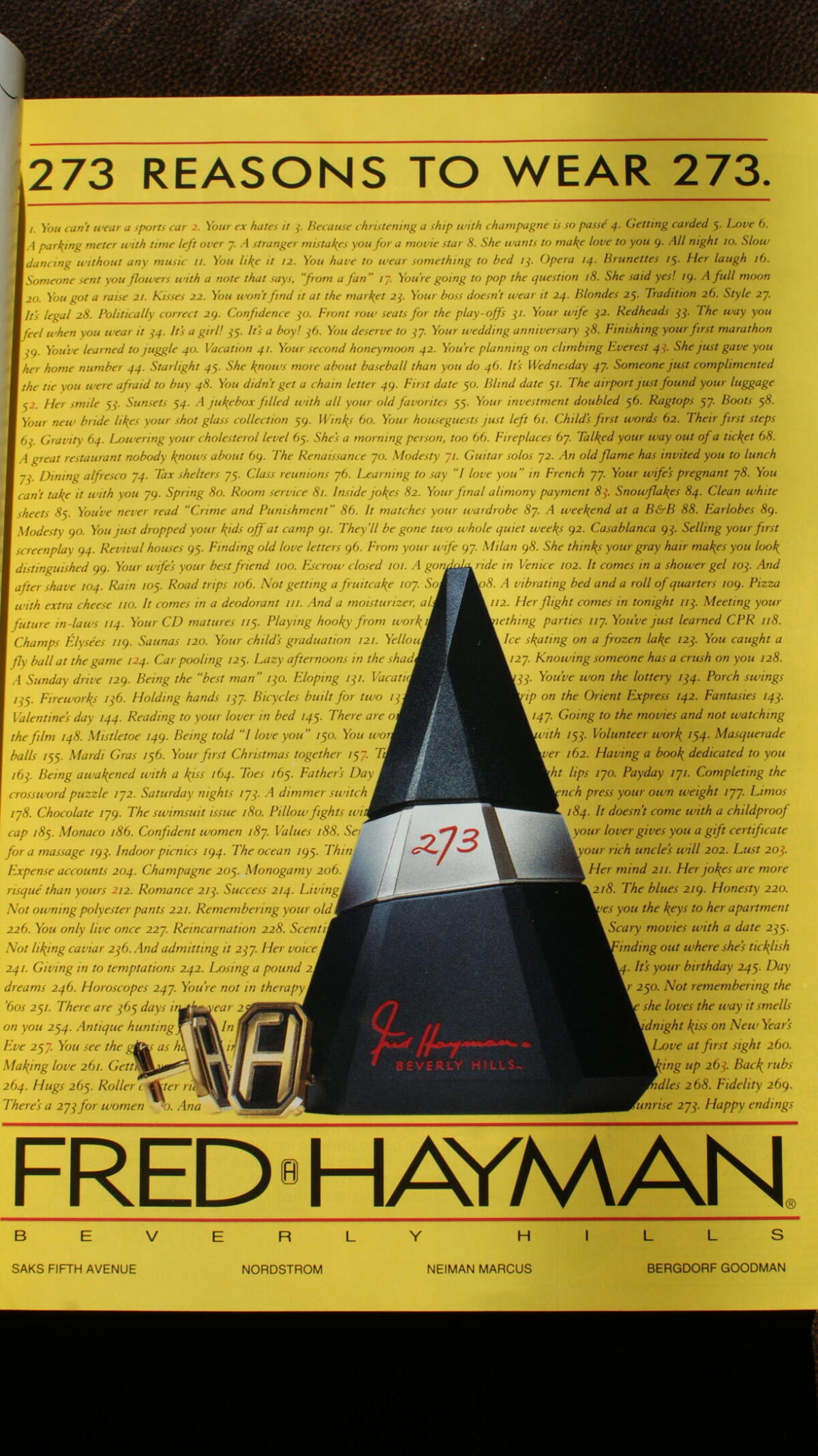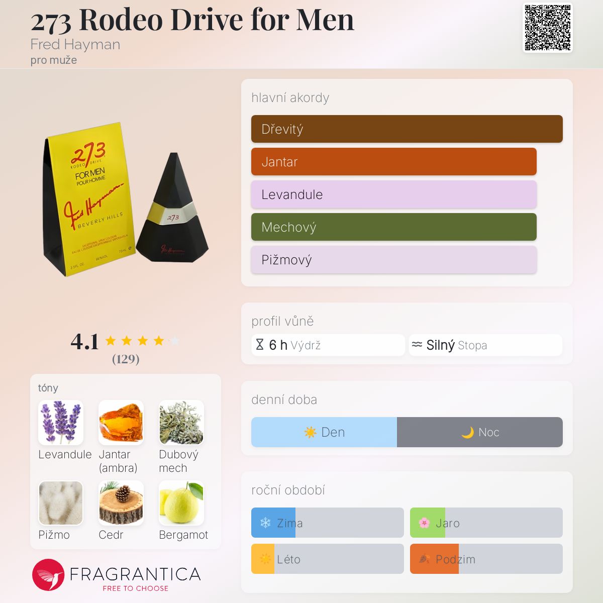 273 Rodeo Drive for Men podle Fred Hayman je Aromatic Fougere vůně pro muže. 273 Rodeo Drive for Men byl/a uveden/a v roce 1990. Vrchní tóny jsou Levandule a Bergamot; střední tóny jsouJantar (ambra) a Dubový mech ; základní tóny jsou Pižmo a Cedr.