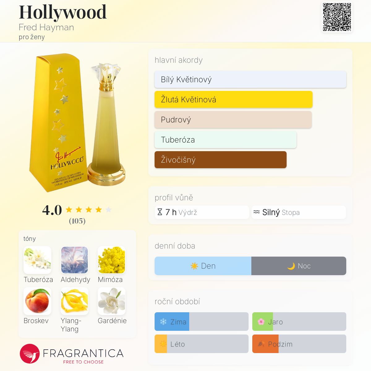 Hollywood podle Fred Hayman je Floral Aldehyde vůně pro ženy. Hollywood byl/a uveden/a v roce 1988. Vrchní tóny jsou Aldehydy, Broskev, Mandarinka a Zelené listí; střední tóny jsouTuberóza, Mimóza, Ylang-Ylang, Jasmín a Růže ; základní tóny jsou Gardénie, Santalové dřevo, Jantar (ambra), Cibetka a Pižmo.